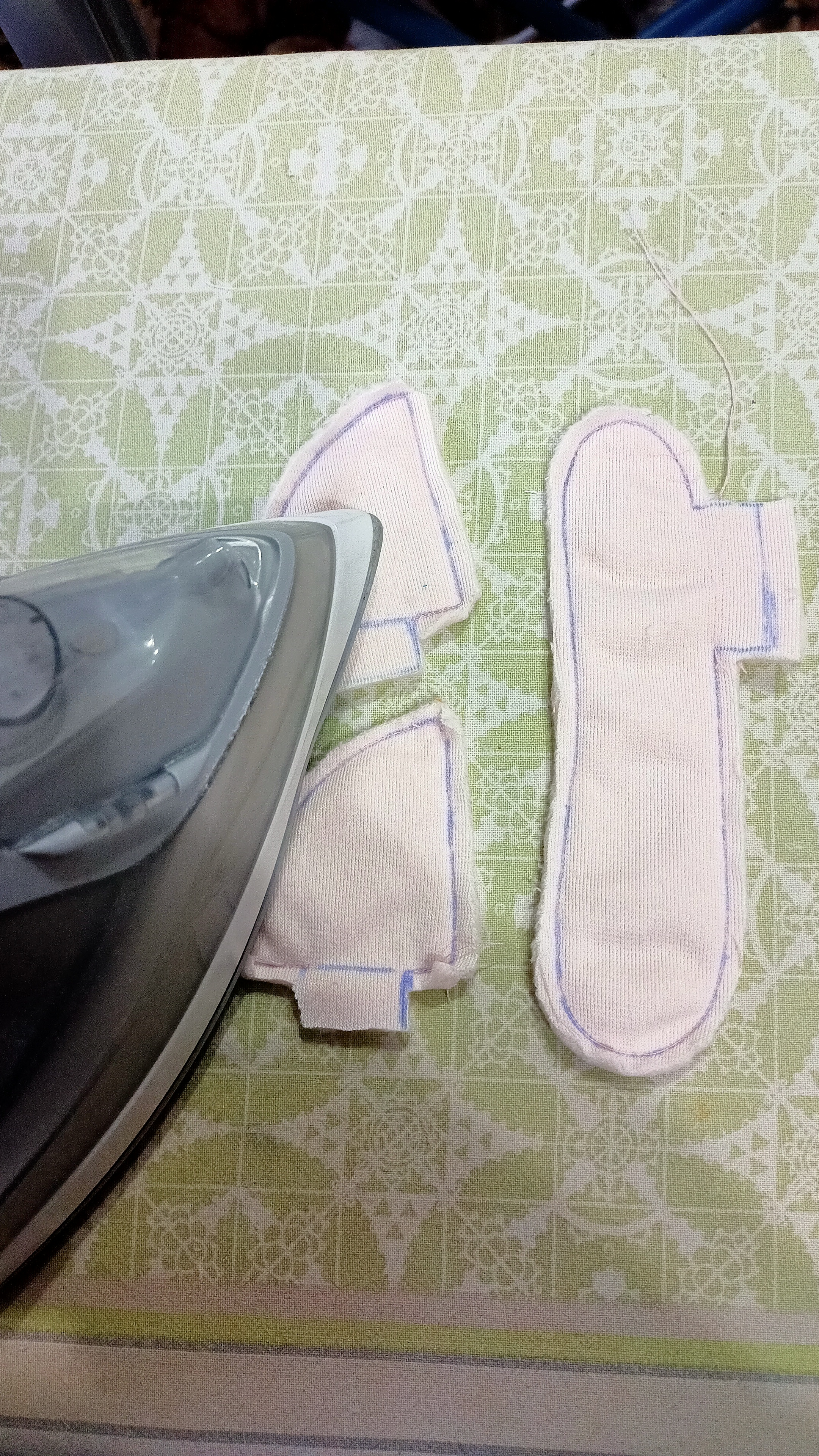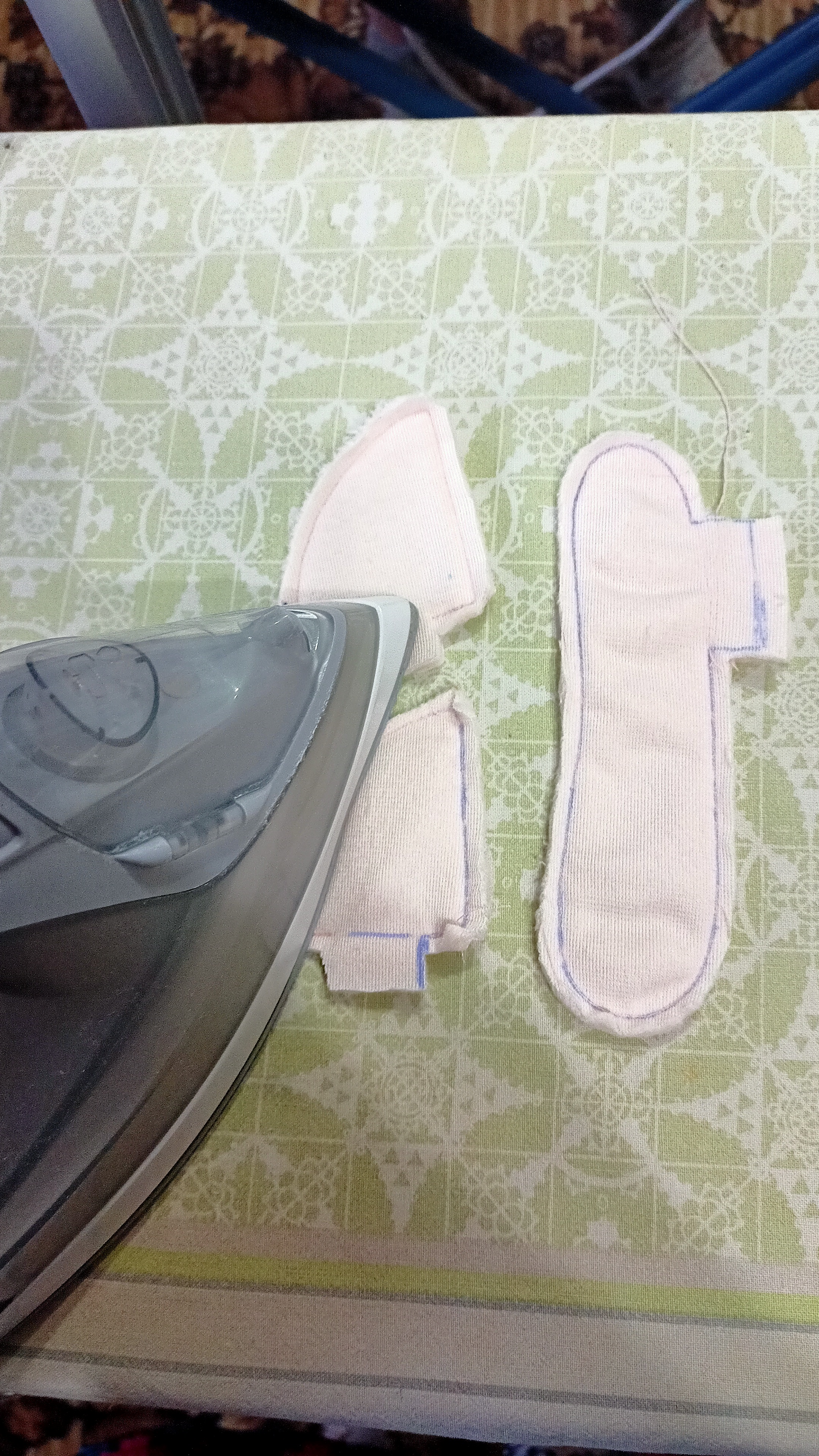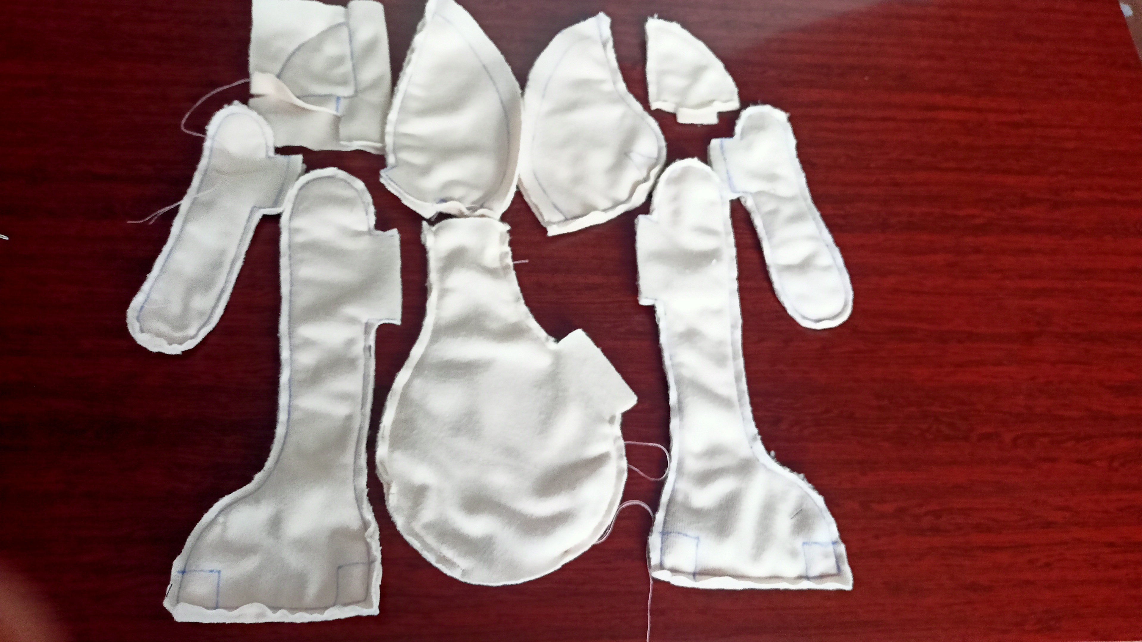 Прострачиваем и прошиваем швом «Назад иголка» по нарисованным нами контурам, оставляя отверстия для выворачивания и места, где детали будут сшиваться с другими деталями (это голова)