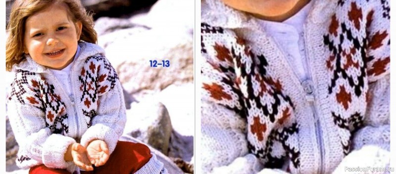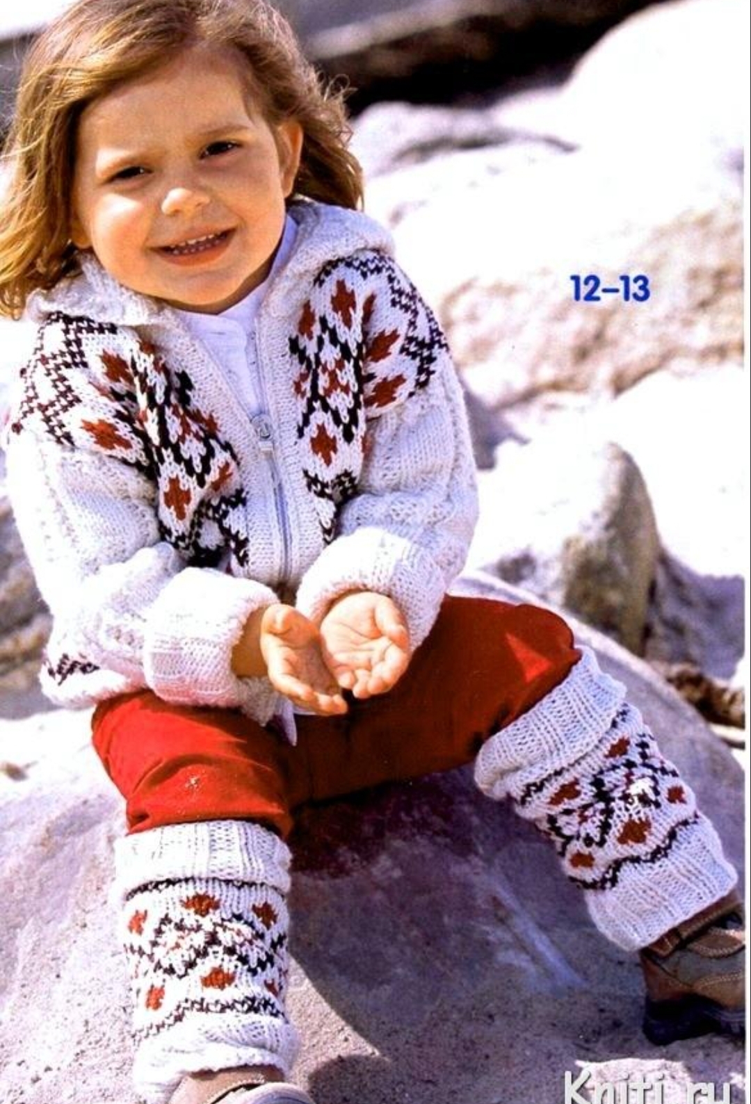 Самое время приступать к вязанию теплых зимних вещей, вот придут настоящие холода, времени для этого просто не останется. Мы предлагаем Вам связать жакет с жаккардовыми узорами, обратите еще внимание на уютные гетры, которые дополнят образ девочки. Маленькому ребенку свойственно быстро воспринимать смену погоды и температуры.