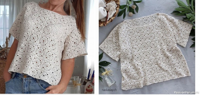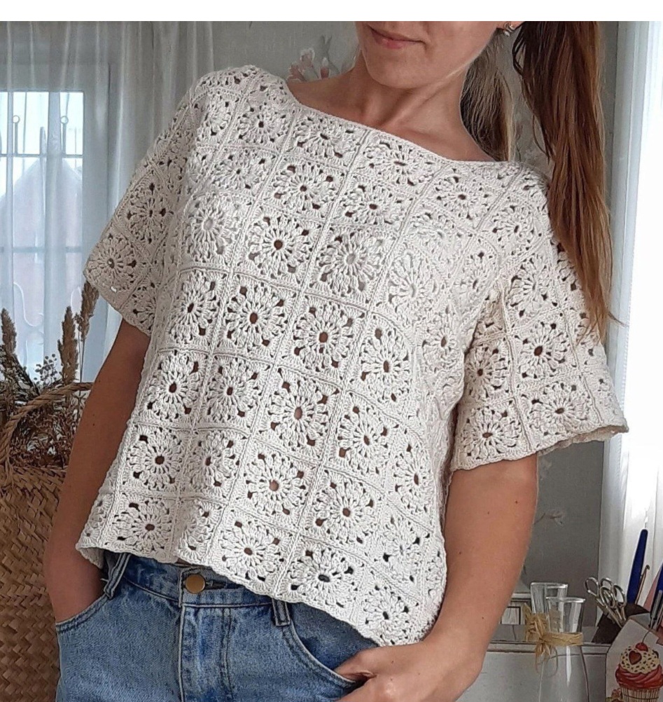 Нежный топ, связанный крючком из множества квадратных мотивов с ажурным цветочным узором. Легкая, дышащая структура и ровные швы делают изделие комфортным и стильным. Идеально подходит для теплого сезона и сочетается с джинсами и шортами.