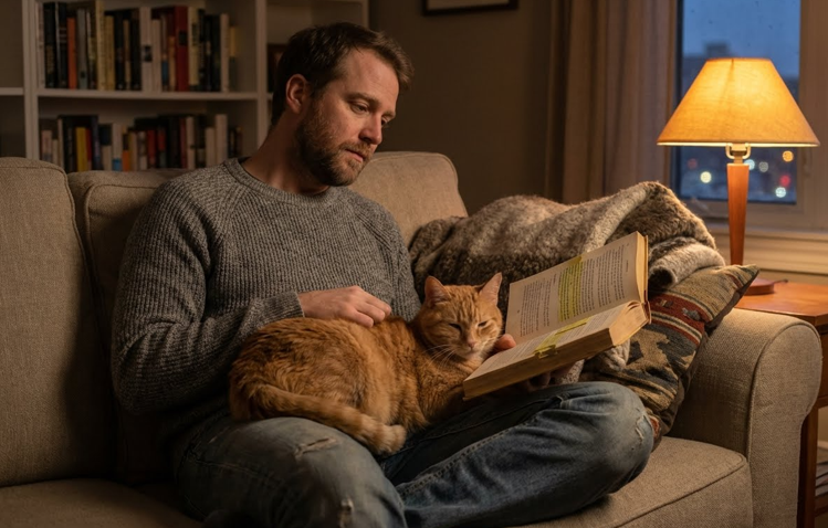 Дома его встретила тишина — но не та, прежняя. Из комнаты донеслось мурлыканье. Муся лежала на пледе, вытянув лапы, и, увидев его, подняла голову. В её взгляде не было упрёка.
