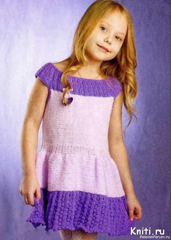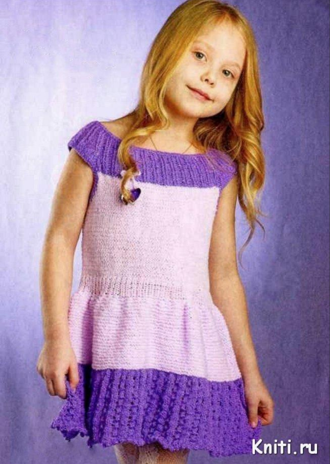 Сборка: выполните боковые швы. Выполните подгиб платья по ажурному ряду. Проймы и горловину обвяжите крючком двумя рядами ст. б/н темно-сиреневой пряжей.