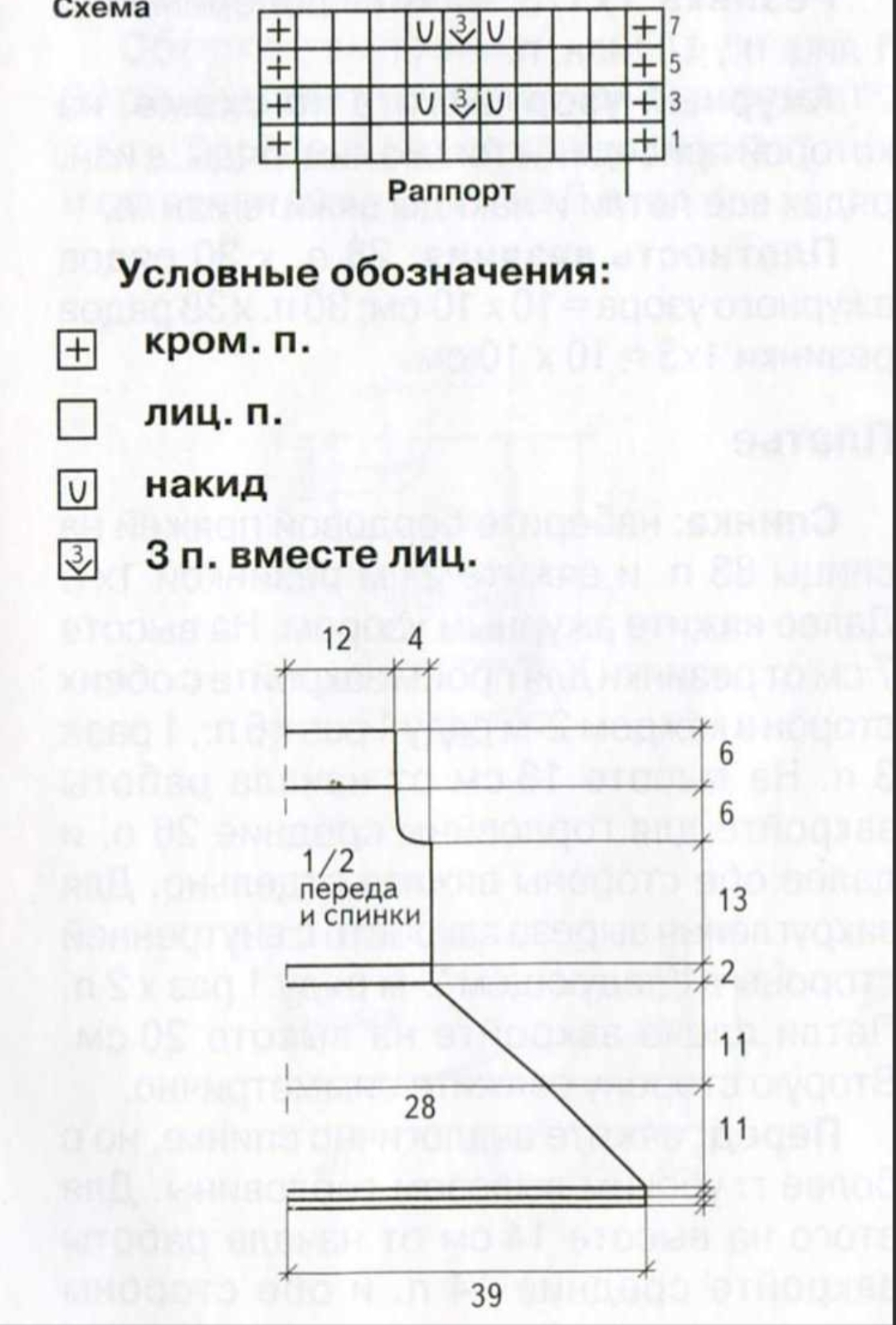 Плотность вязания: 23 п. х 36 рядов лиц. глади = 10 х 10 см; 20 п. х 36 рядов ажурного узора = 10 х 10 см.
