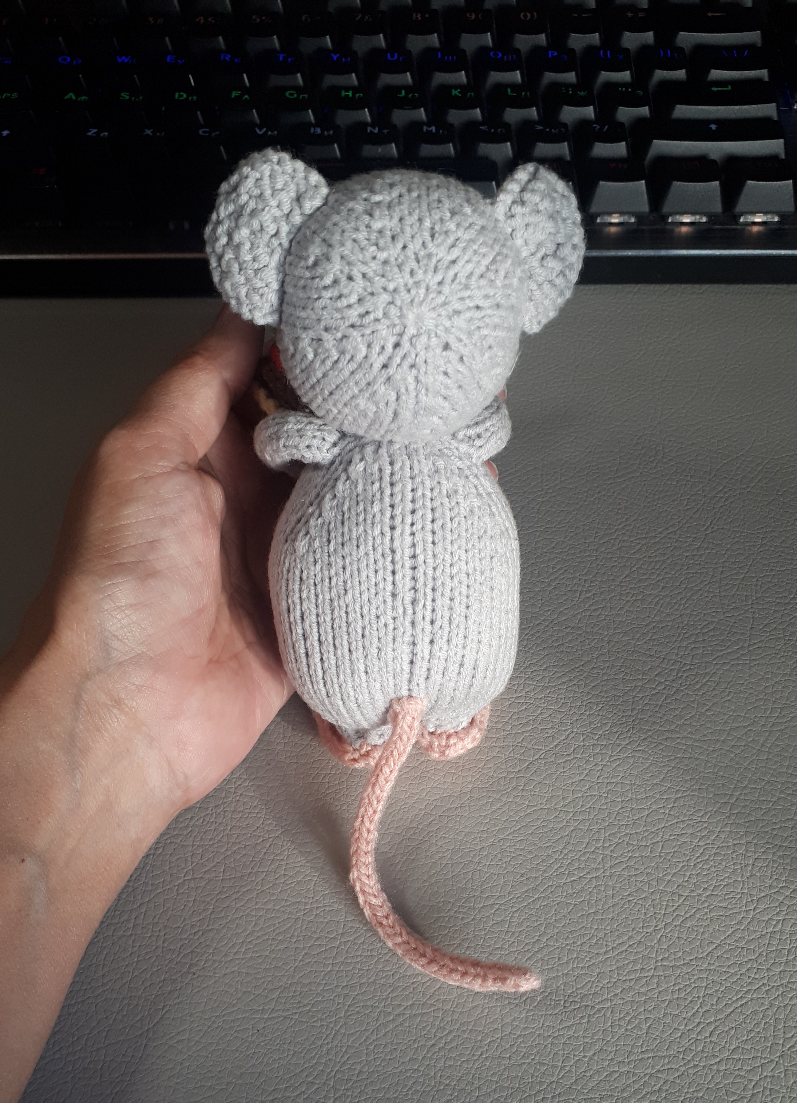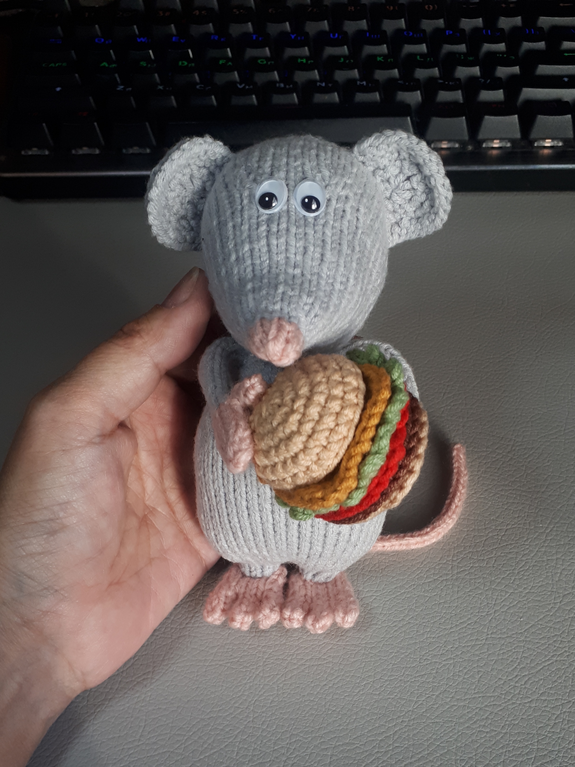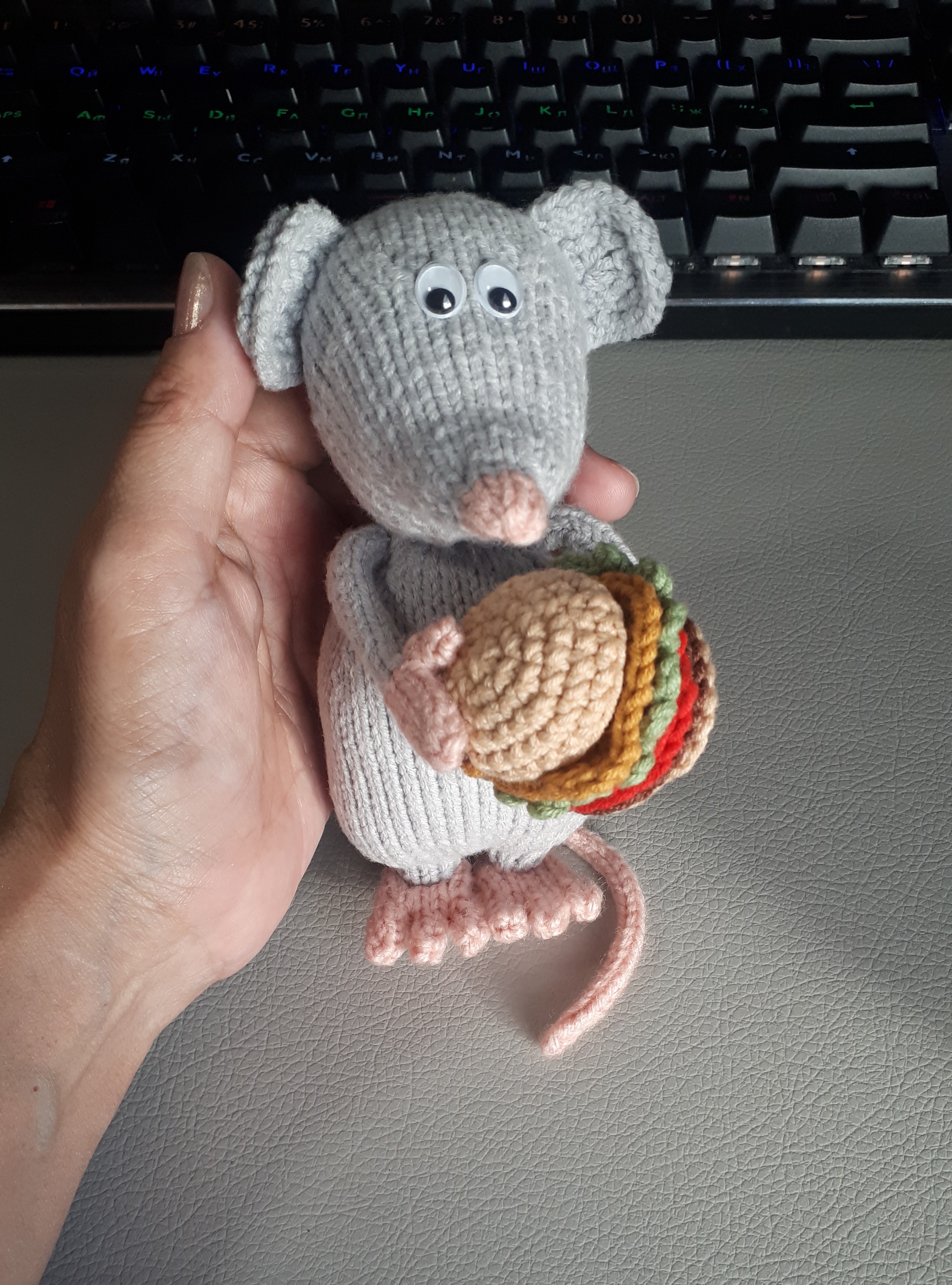 Смешной крыс от Аманды Берри. Вообще, в лапках должен был быть кусок пиццы, но у меня не было нужных цветов для него. И глазки тоже были другими, просто маленькие кружки из белой нитки и черные зрачки-узелки. Поэтому он у меня лежал с лета заброшенный. Делать глазки из фетра мне не хотелось. А на днях попались в магазине такие овальные глазки с бегающим зрачком, клеевые, прекрасно подошли. Когда зрачки падают на бок, у него становится такой смешной виноватый вид, будто его поймали на месте преступления