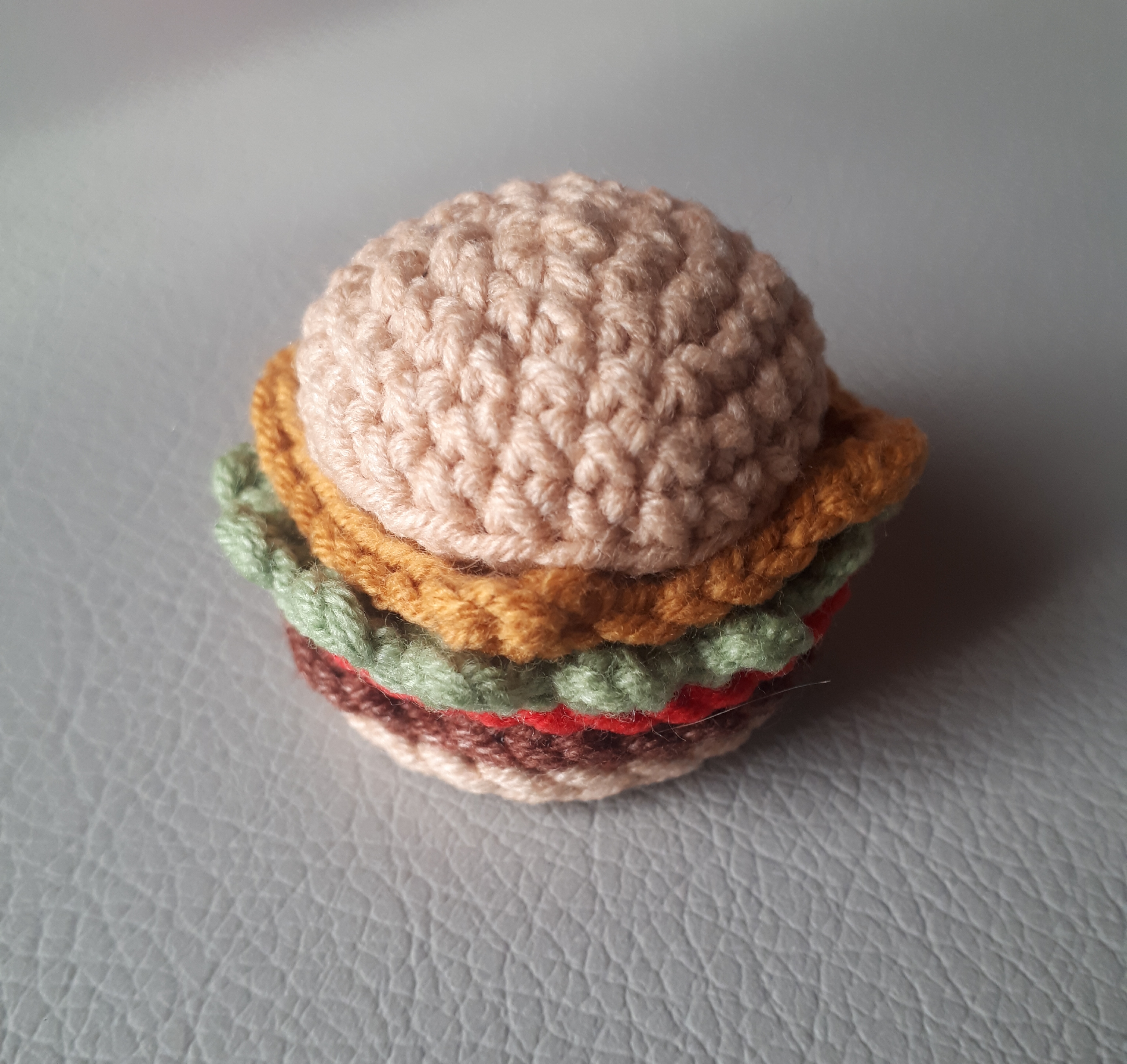 Пластик сыра можно связать попроще, просто поворотными рядами, все равно все детали потом сшиваются. Можно сделать маленький брелок из такого бургера.