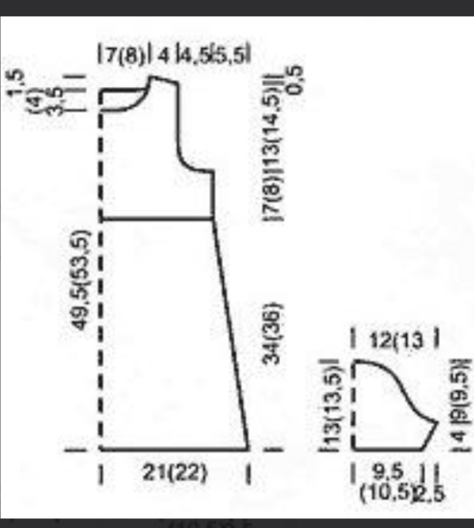 Спинка :Вязать так же, как и перед, однако только через 53 (57,5) cm от начала работы начать вывязывать вырез горловины: закрыть средние 25 (30) п., затем в последующем 2м р. закрыть 1 x 1 п..