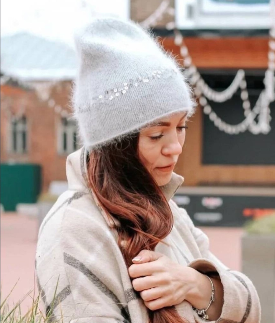 Эта вязаная шапка не только уютная, но и изысканная благодаря блестящим украшениям. Мягкий материал и стильный дизайн делают её идеальным аксессуаром для холодного времени года.