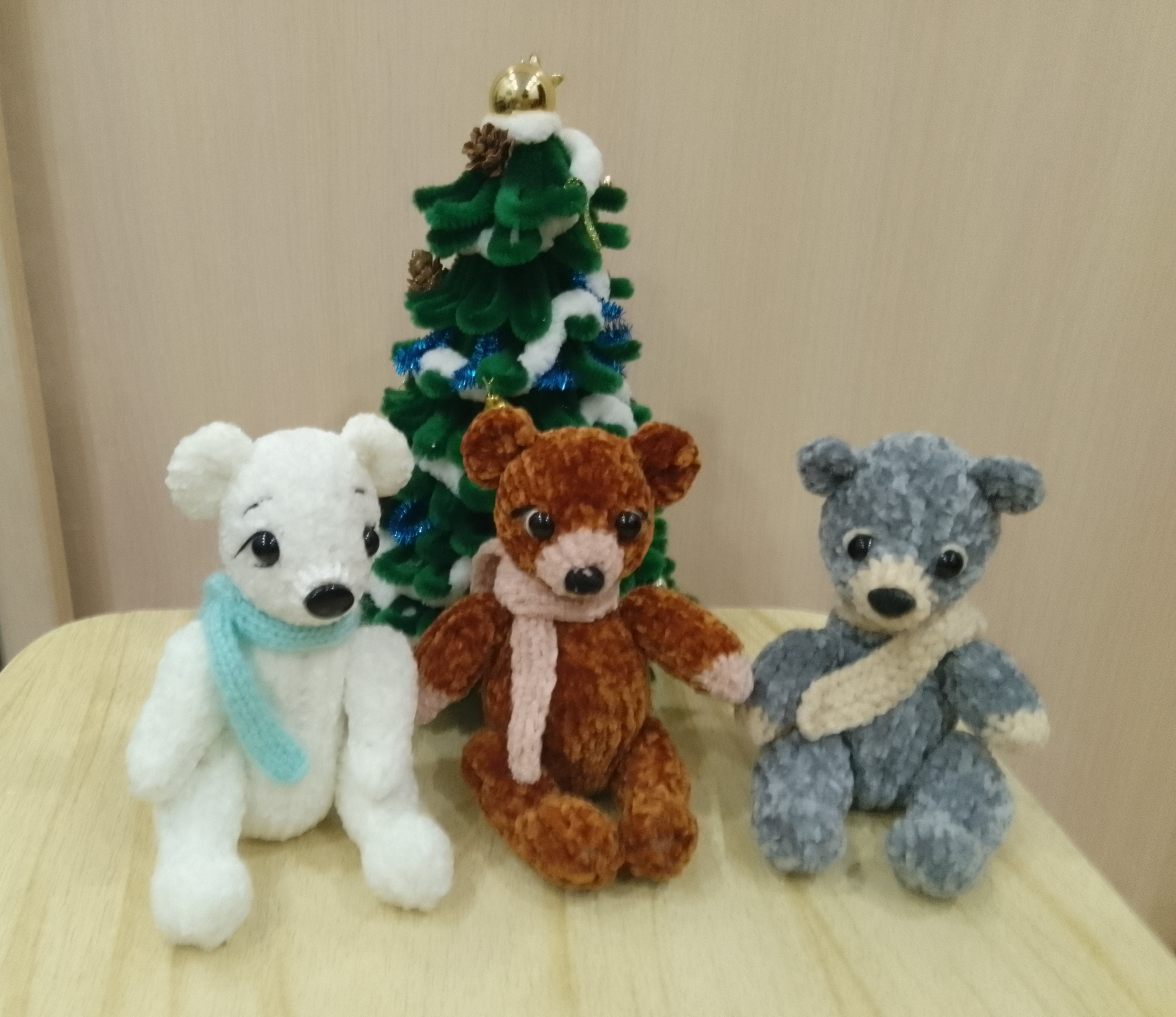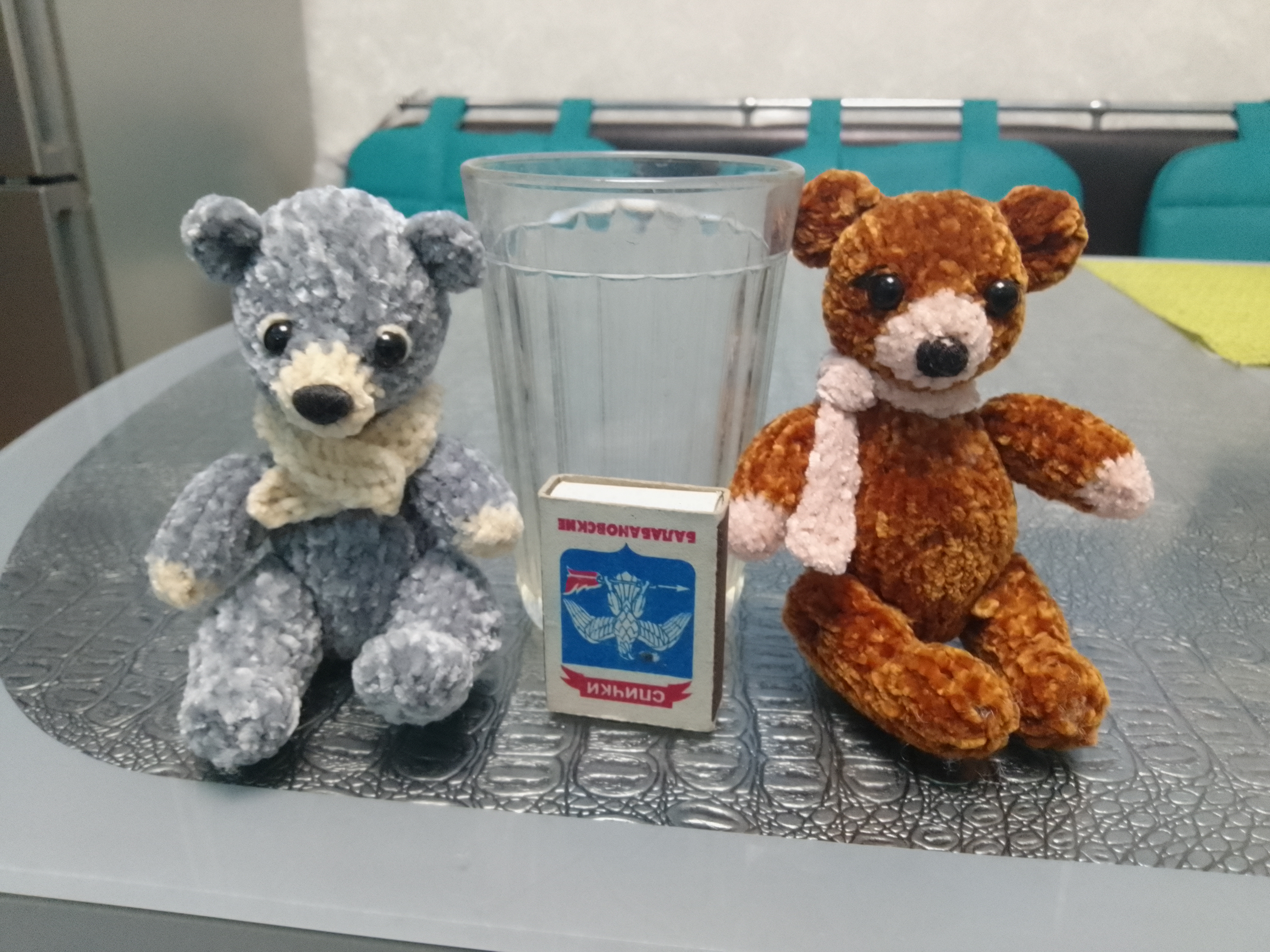 Мишек вязала из китайской пряжи купленной в фикс прайс состав полиэстер. Пряжа приятная на ощупь и игрушки получаются очень приятные. В сидячем положении мишки чуть ниже гранитного стакана. 😁