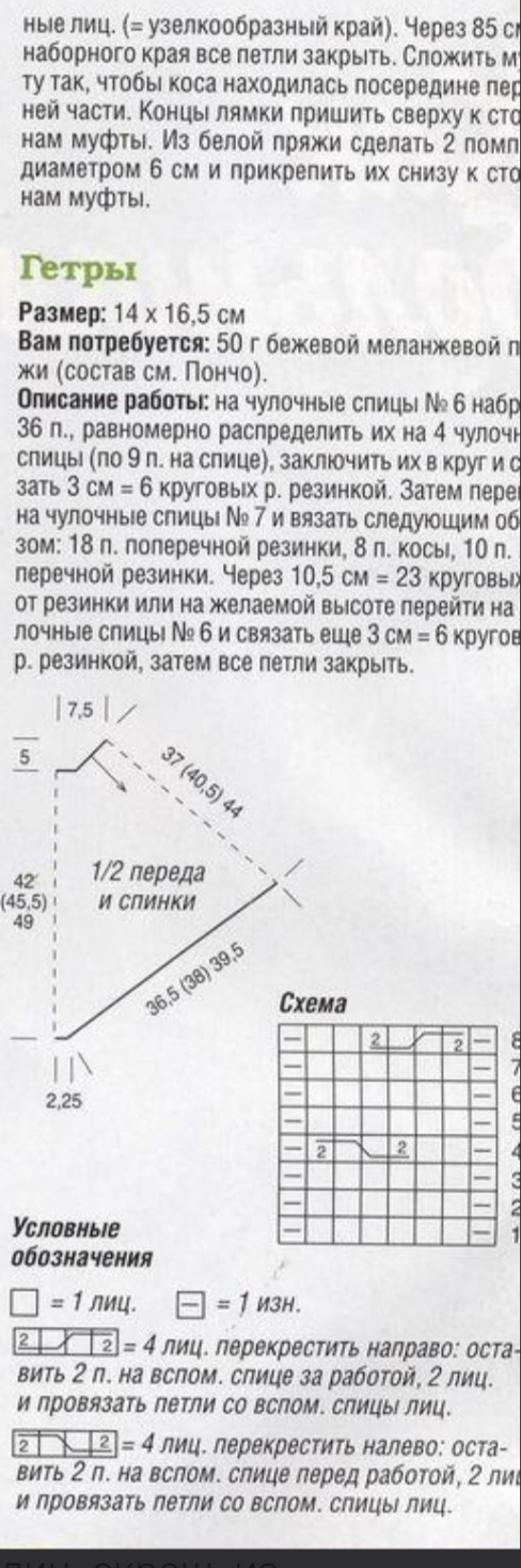 Спинка и перед: на чулочные спицы № 7 набрать бежевой меланжевой нитью 60 п. и вязать круговыми р. следующим образом: * 8 п. косы, 7 п. поперечной резинки, повторить от * 3 раза. 1-я и 3-я косы = плечи, 2-я коса = середина переда, 4-я коса = середина спинки. Для расширения пончо расширять участки из поперечной резинки. Для этого прибавить по узору до и после 2-й и 4-й косы в каждом 2-м круговом р. 31 х и в каждом 4-м круговом р. 3 (5) 7 х 1 скрещ. п. из протяжки = 196 (204) 212 п. (при необходимости перейти на круговые спицы). Через 36 см = 79 круговых р. (39.5 см = 87 круговых р.) 43 см = 95 круговых р. связать двойной белой нитью еще 1 см = 2 круговых р. лиц. гладью, при этом поверх каждой косы провязать 2 х 2 п. вместе лиц. = 188 (196) 204 п.; затем все петли закрыть.