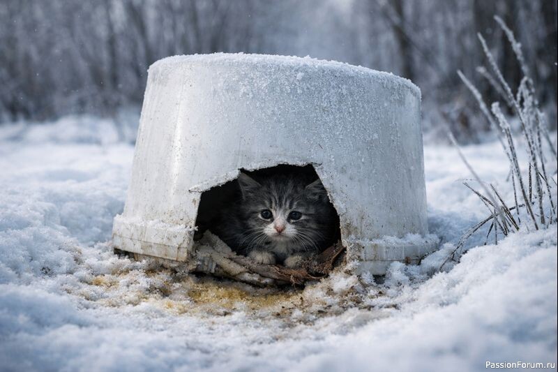 О том, что кто‑то, возможно, не выбросил его в чистое поле, а сделал ему «дом». Поставил ведро, вырезал дырку. Может, это был человек, который не мог взять домой — жена не разрешила, аллергия, съёмная квартира, «у нас свой кот». Или человек, у которого самого средств едва хватало на жизнь — но он всё равно сделал хоть что-то.