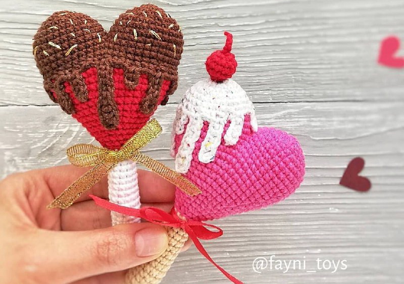 Это очаровательное рукодельное изделие выполнено в виде сердца-мороженого, что придаёт ему уникальность и привлекает внимание своим креативным дизайном. Вязание крючком, использованное для создания этого изделия, имеет долгую историю, уходящую корнями в древние времена. Яркие цвета – шоколадный и розовый – сочетаются с изысканными деталями, такими как «глазурь» и «вишенка», что подчеркивает праздничный стиль и дарит радость. Красная и золотая ленточки добавляют изделию изысканности и завершенности.