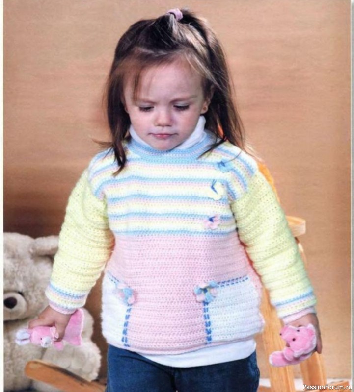 полуст. с/н. На высоте 21 см продолжить вязание, чередуя в каждом р. цвета нитей в след. порядке: голубой, белый, желтый, розовый. На высоте 24 см от начала вязания для пройм убавить с обеих сторон в каждом р.