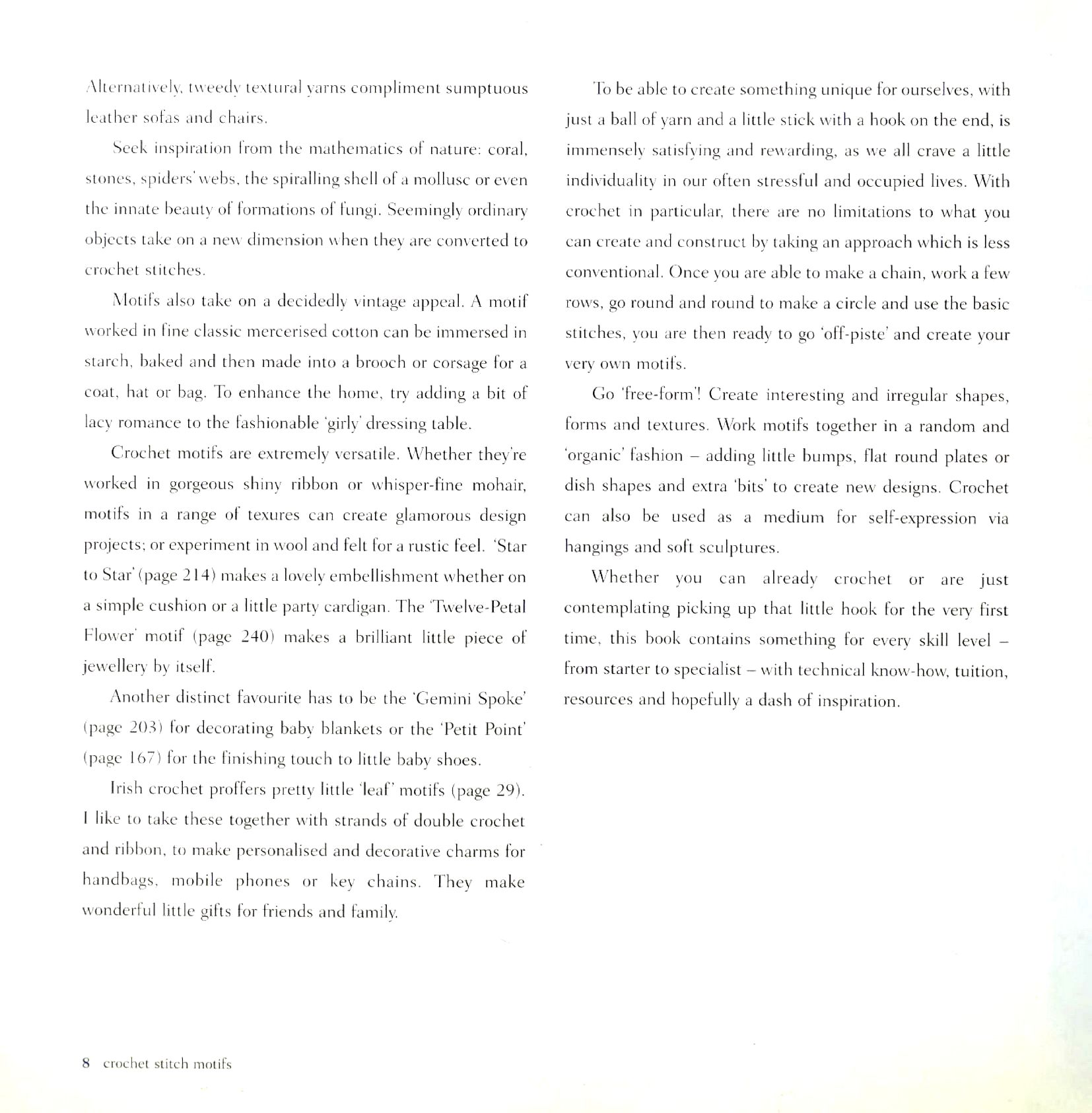 Книга «Crochet Stitch Motifs», содержащая вдохновляющую коллекцию из 250 узоров, станет незаменимым справочником для любителей вязания крючком. От трилистника «Попкорн» и двухцветного шестиугольника до узора «веерные точки» и ажурного креста — каждый из узоров легко может быть использован в качестве основы для сумок, пледов, украшений и многого другого. К каждому узору прилагается полноцветная фотография и четкие и понятные инструкции.