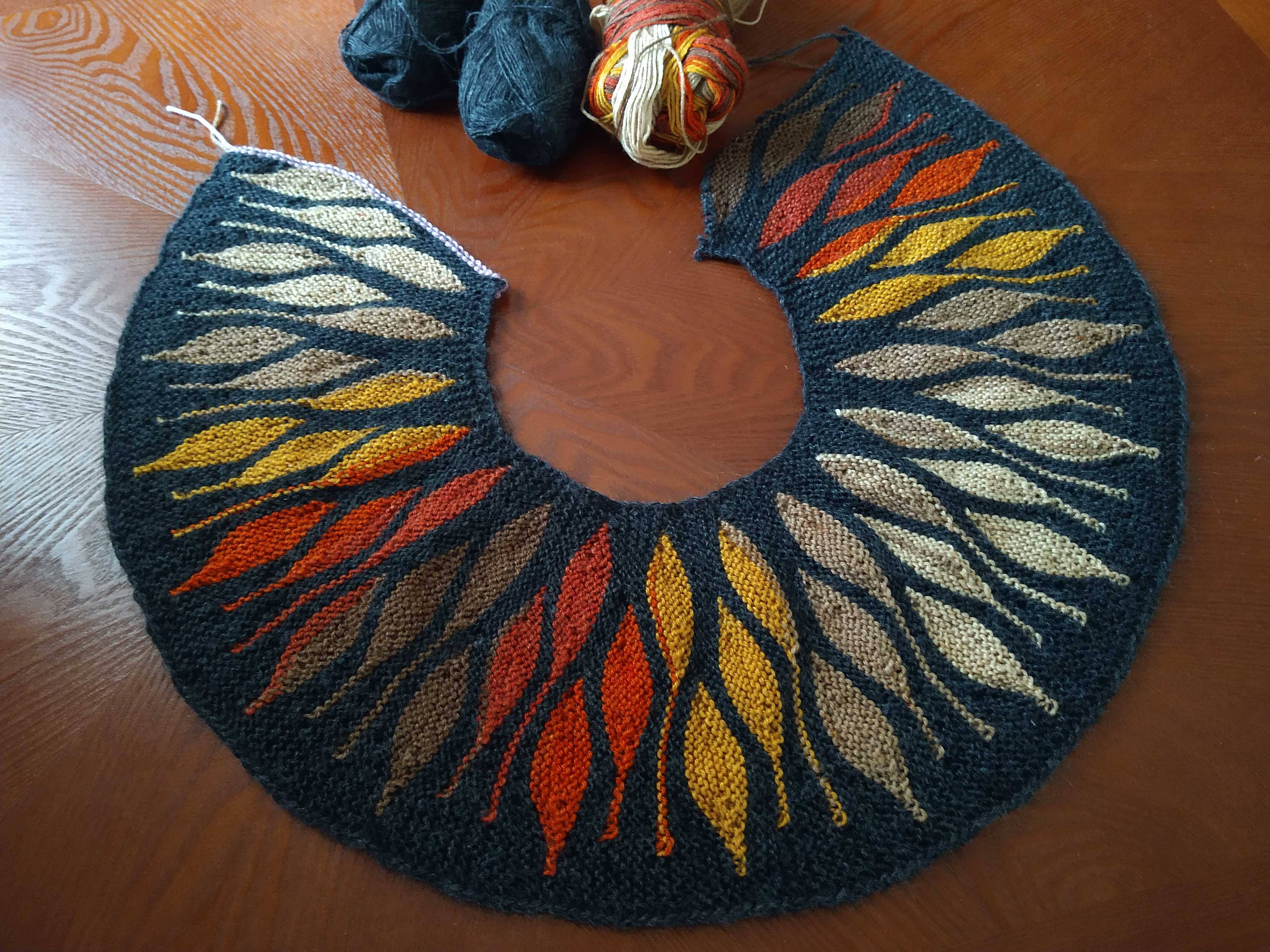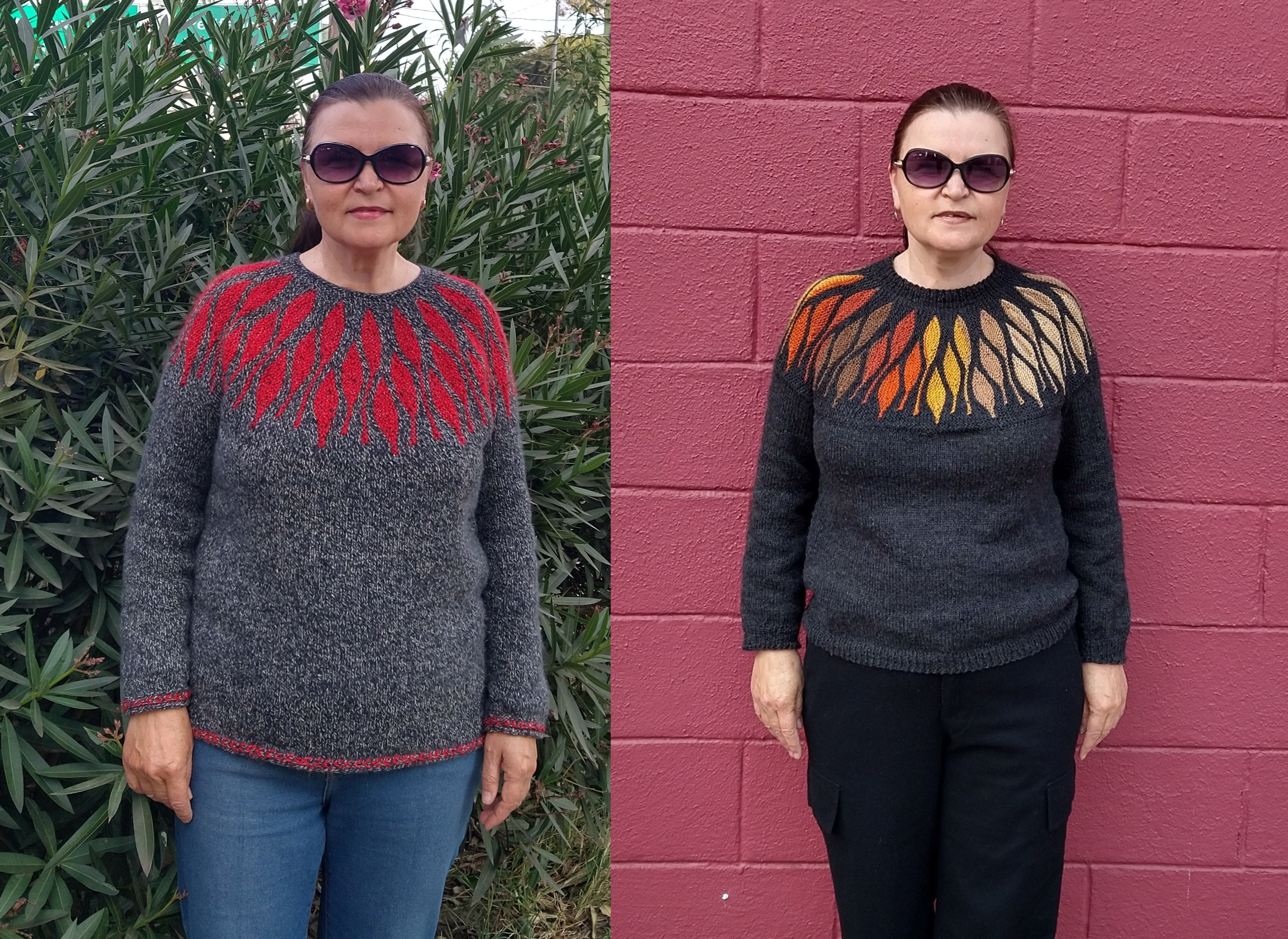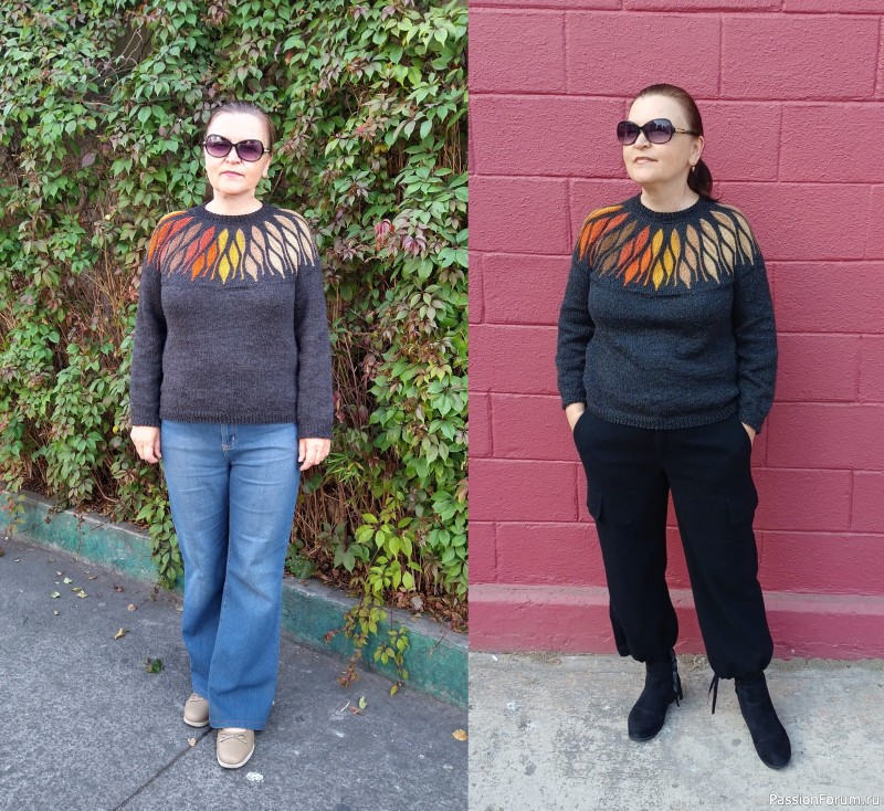 Оба варианта смотрятся стильно! Интересный узор. Его, наверное сложно вязать с круглой кокеткой. Обычно геометрический орнамент. Я вязала мужу ещё в студенчестве (40 лет назад), не все сразу получилось.