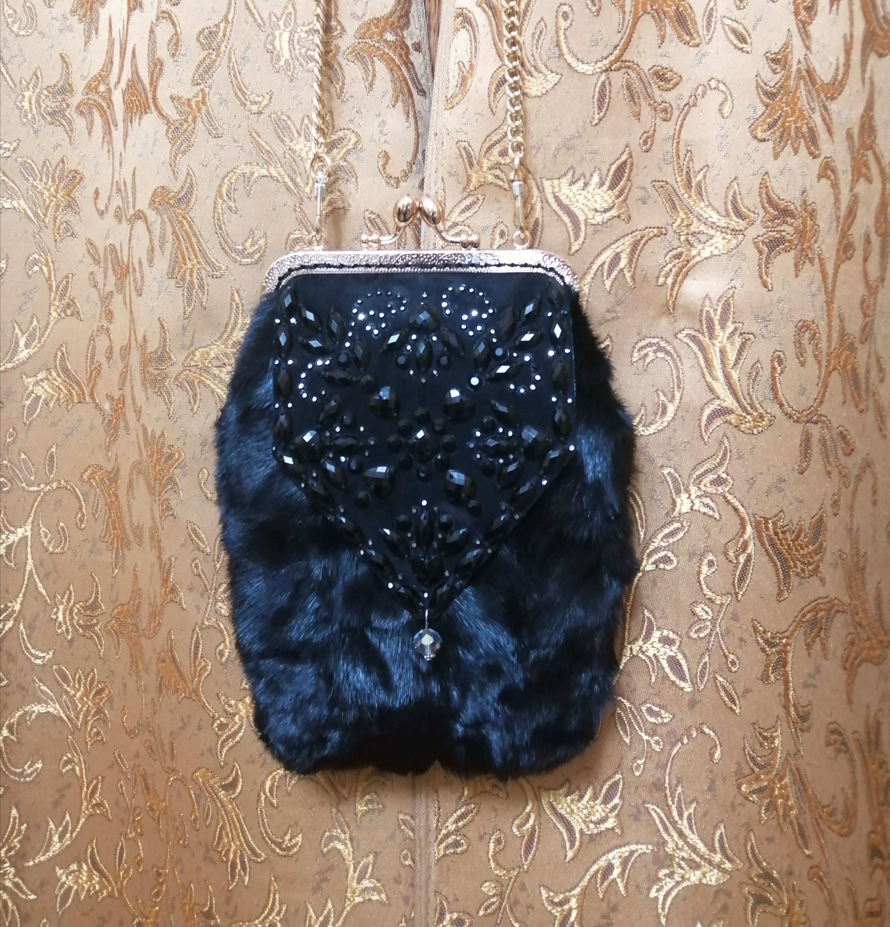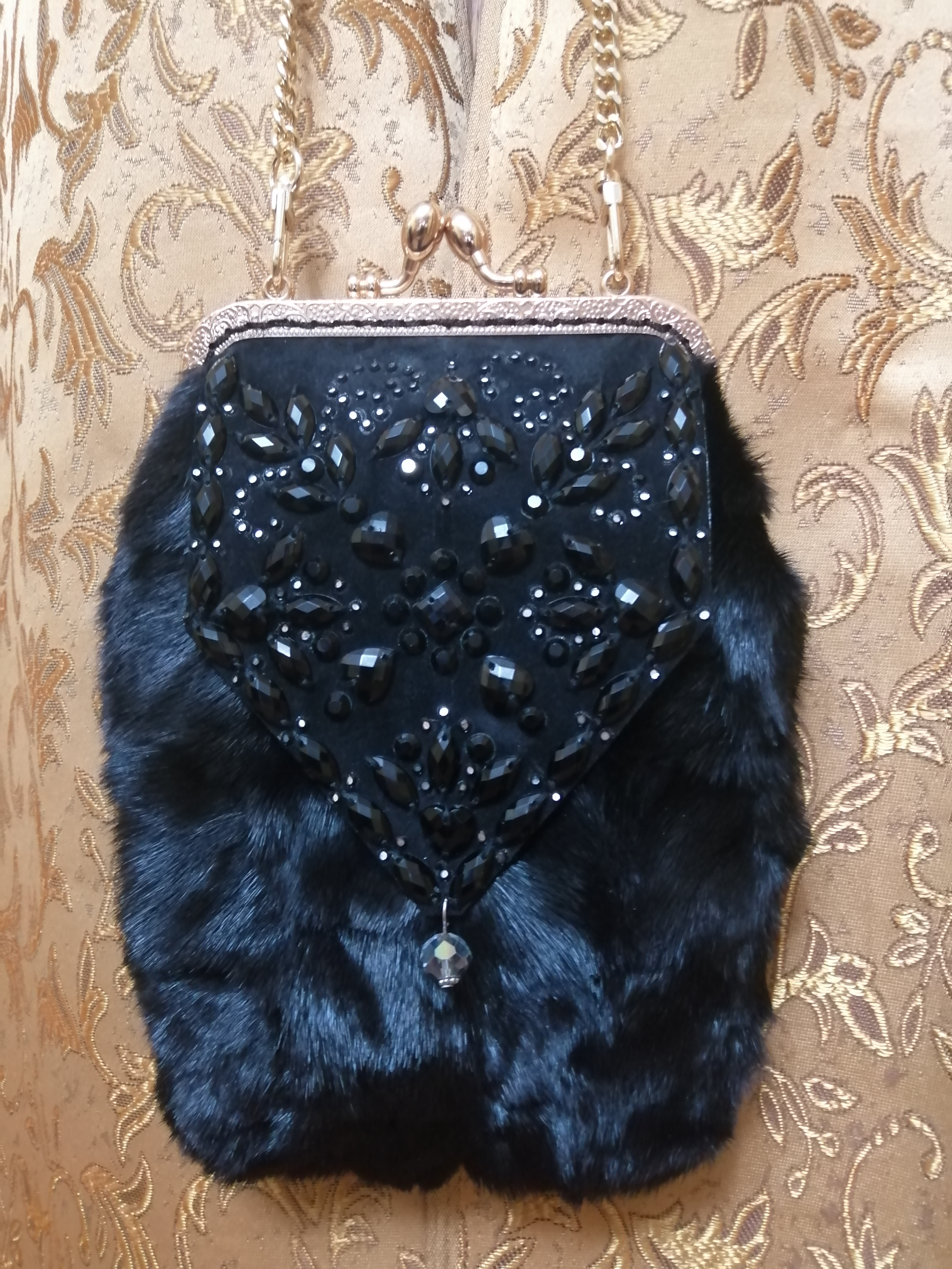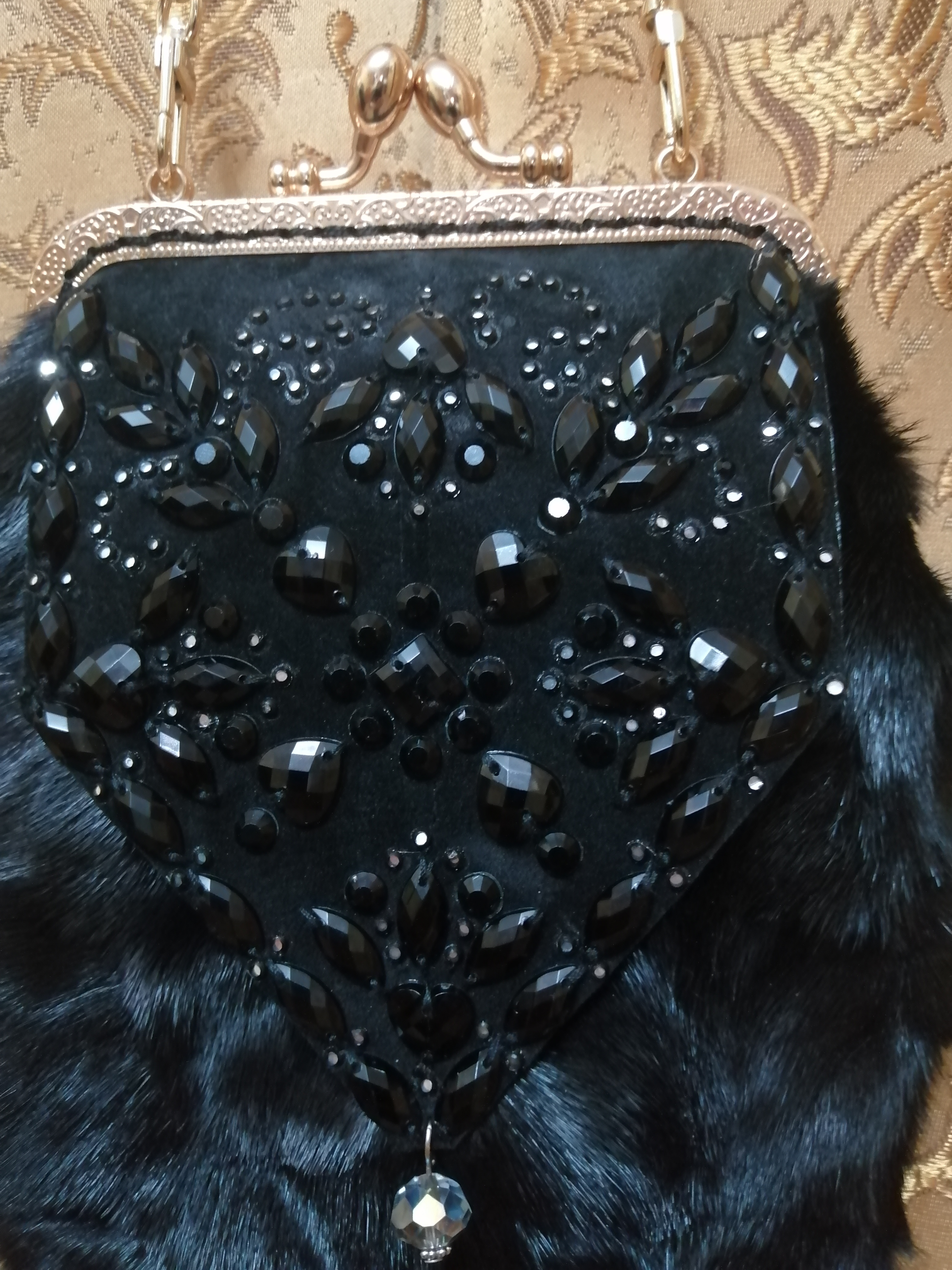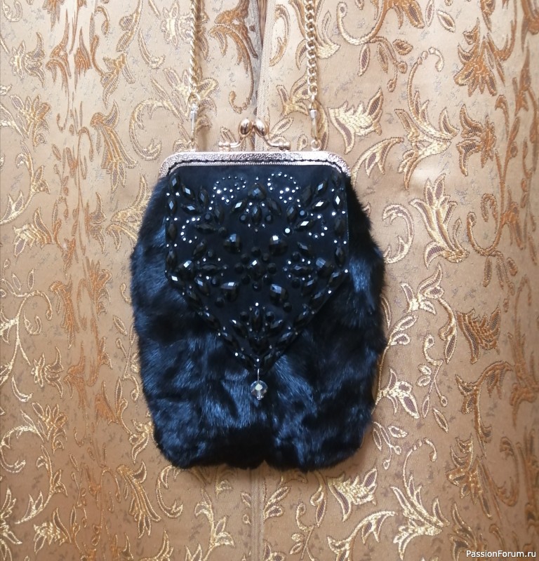 Потрошу всё ту же старую шубу из кусочков норки. Украшение вышито стразами на замше. Подклад - из микровельвета. Внутри - два кармашка. Размер примерно 20х15 см.