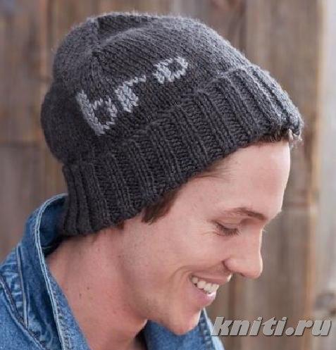 Эта мужская модель в классическом дизайне подойдет для всех случаев и возрастов. Украшена дружелюбной надписью на английском языке, вышитой поверх вязаных петель. Но можно обойтись и без нее, тогда получится просто удобная и теплая шапка для повседневной носки.