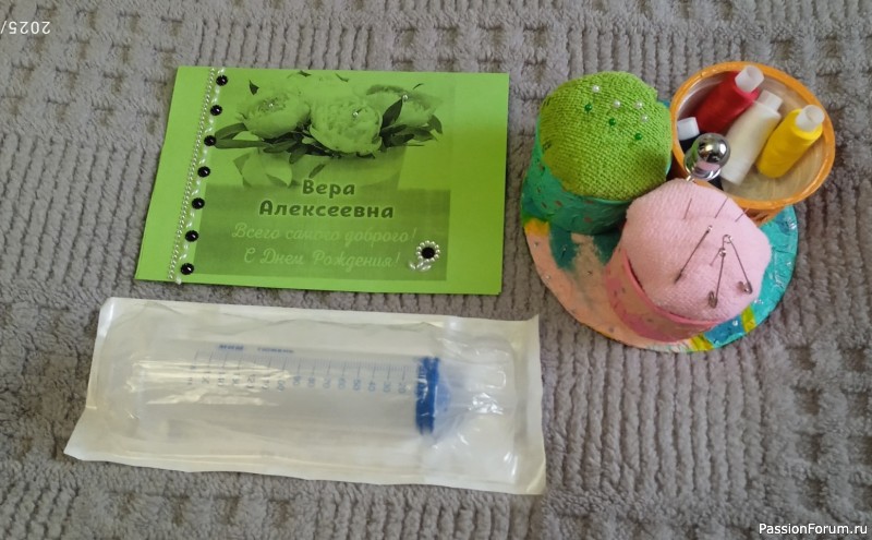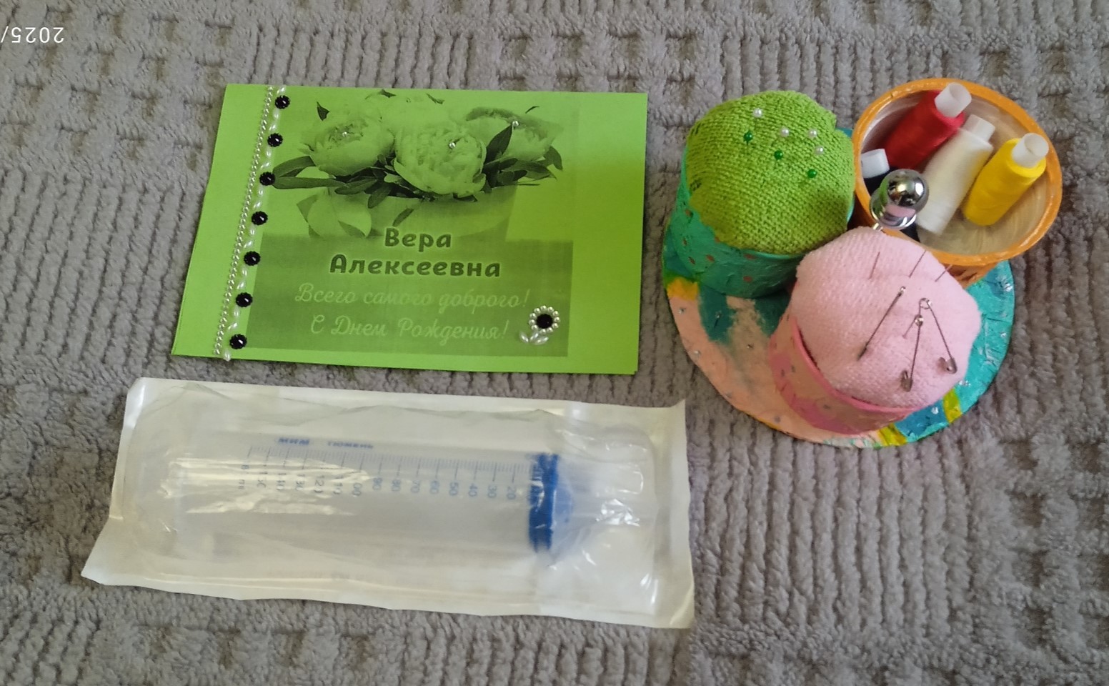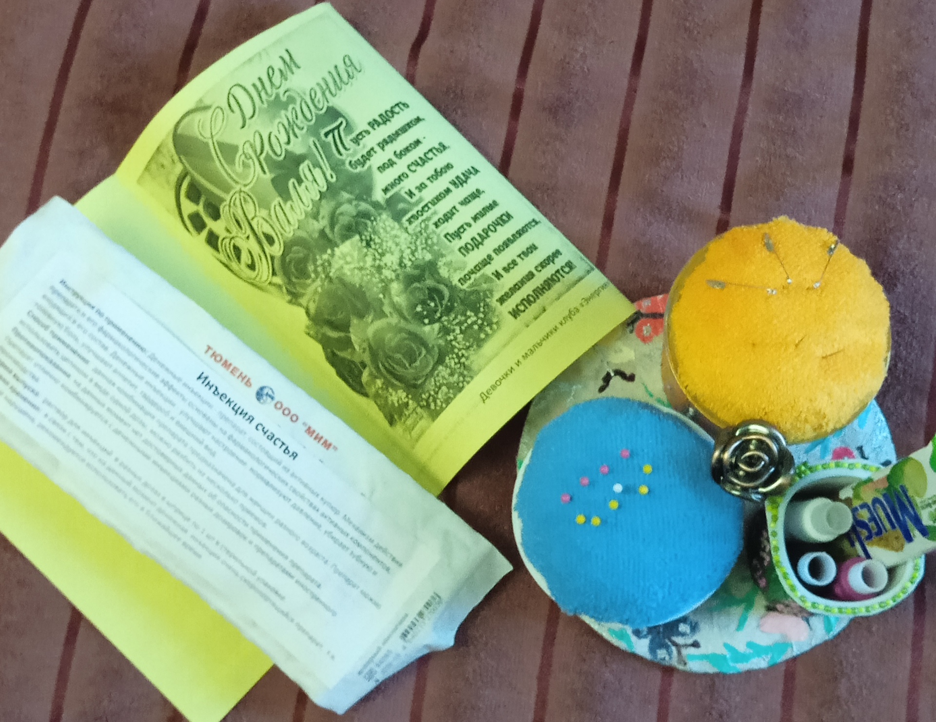 Каждый год члены нашего клуба "Энергия" получают в День рождения небольшие подарки, сделанные своими руками. В 25 году каждая получила игольницу, сделанную из подручных средств с содержимым. Приятно, что подключились ещё: одна вязала следочки, а вторая шила сумочки для документов из чайных пакетиков. Вот некоторые: