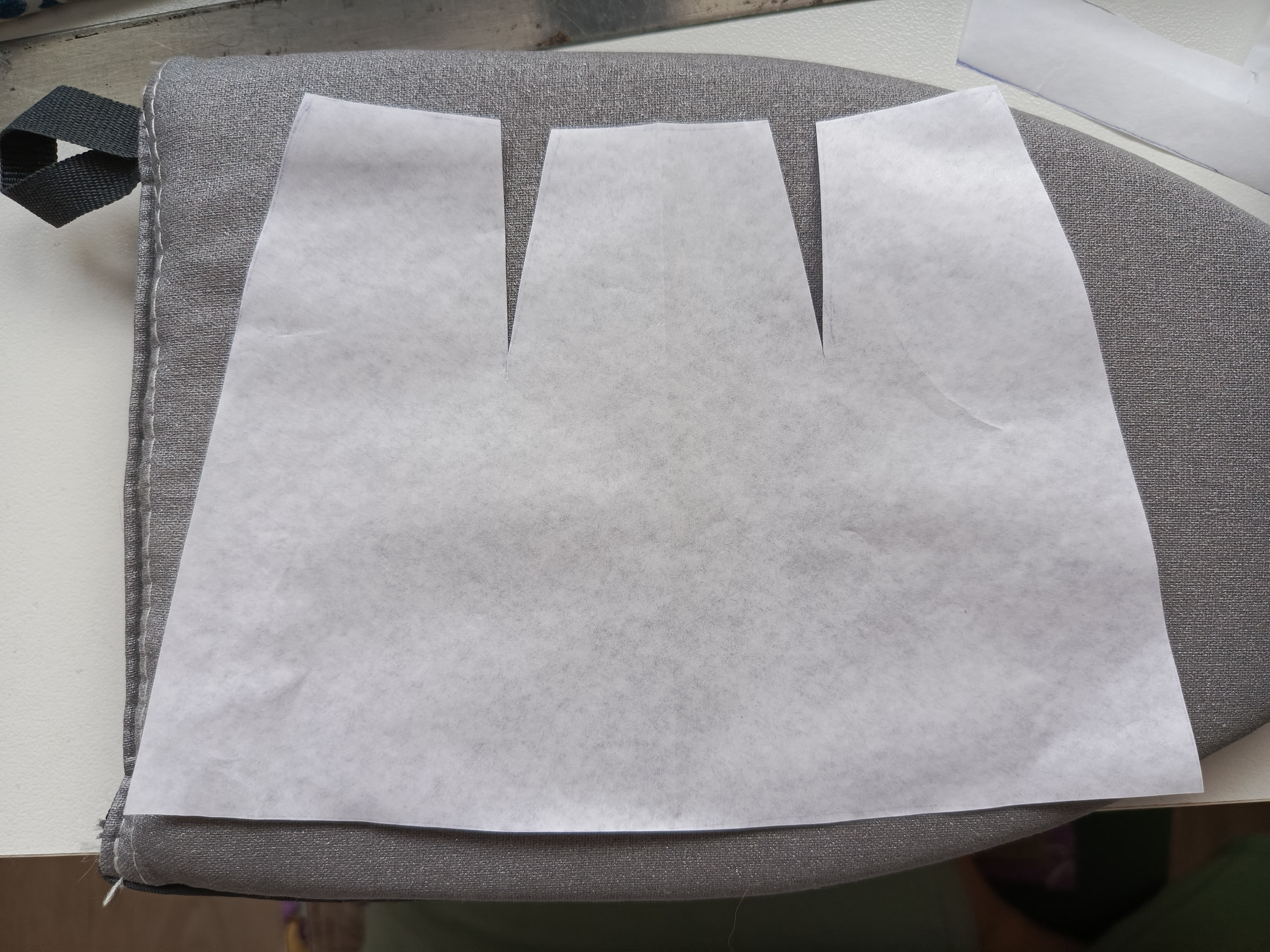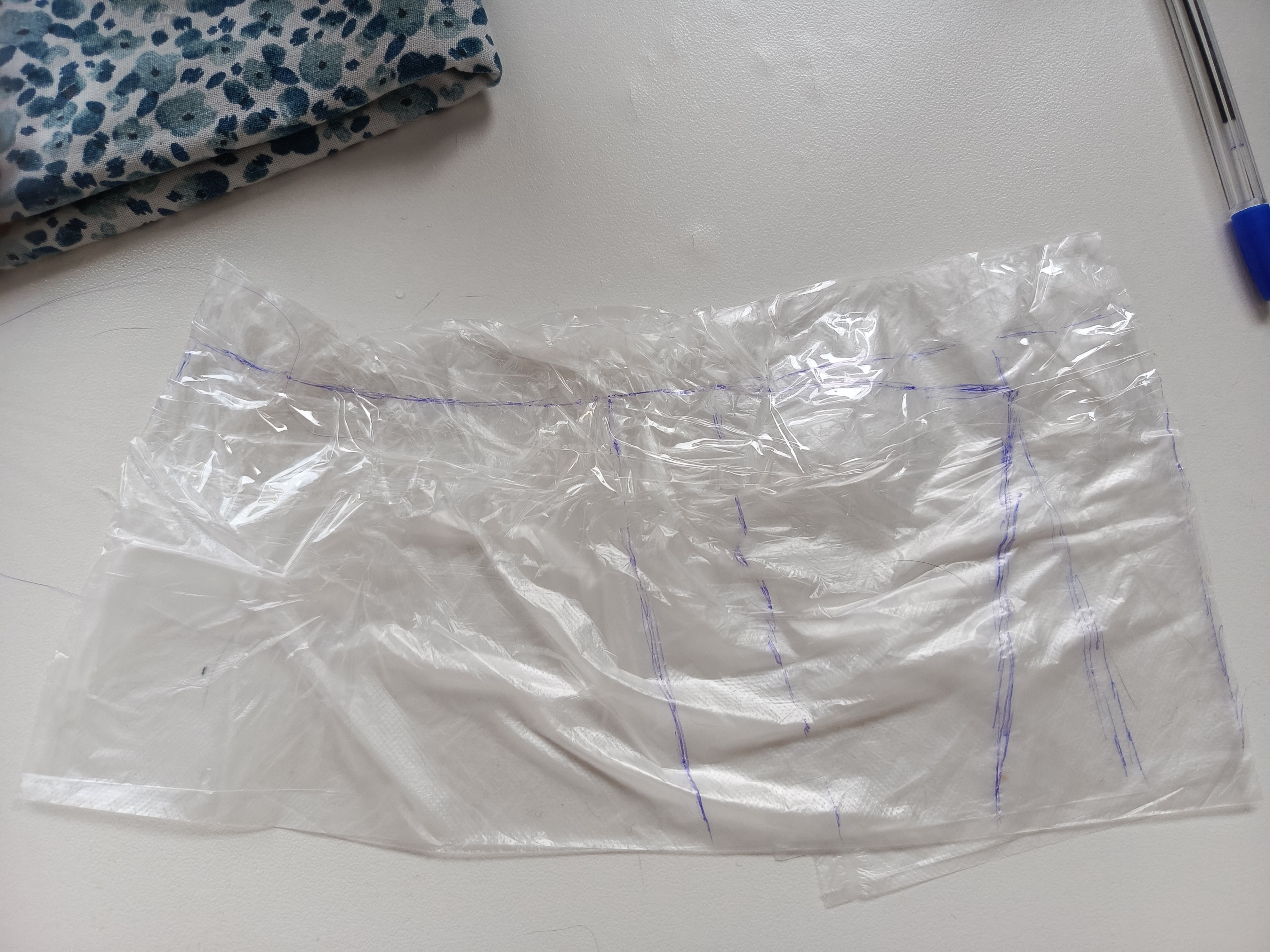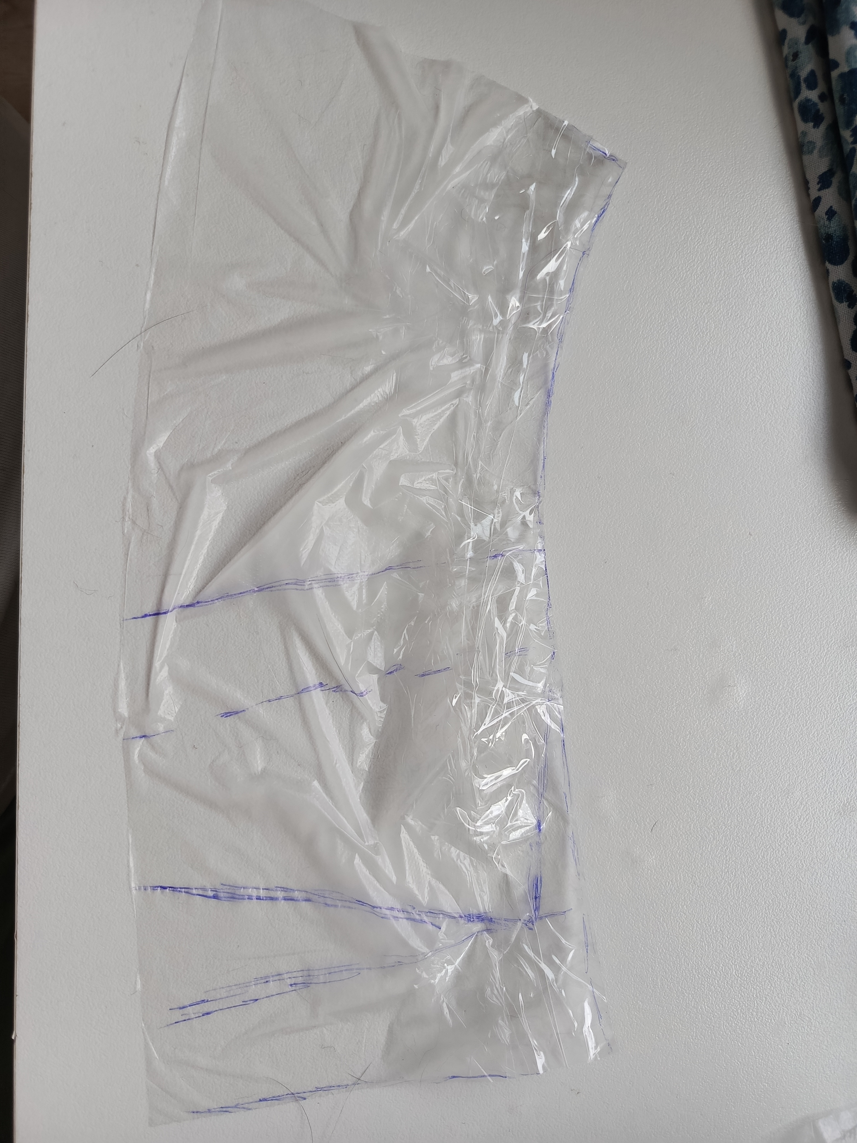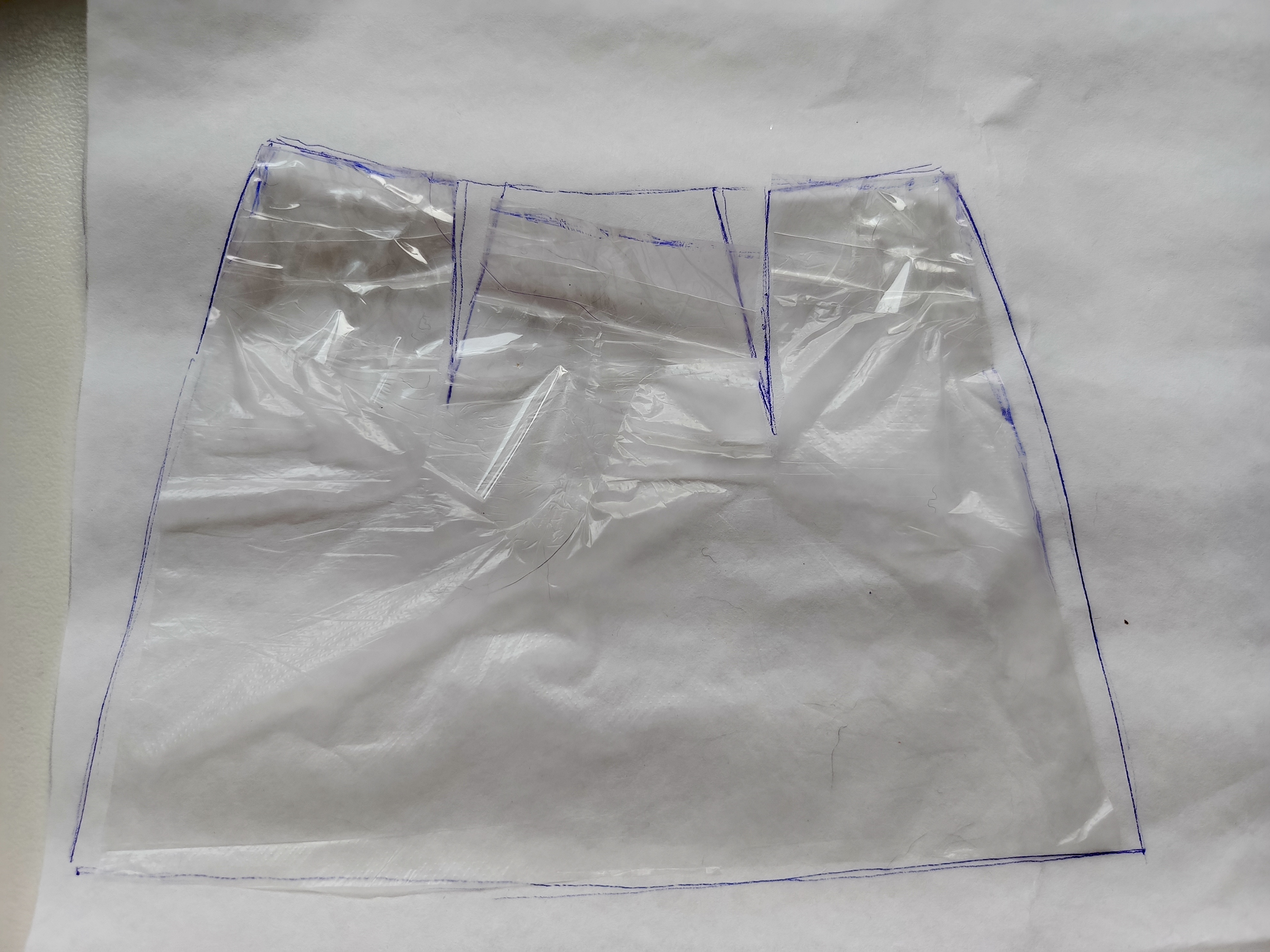 На выкройке из полиэтилена одна деталь заходит на другую. На кальку надо переснять левую и правую по отдельности.