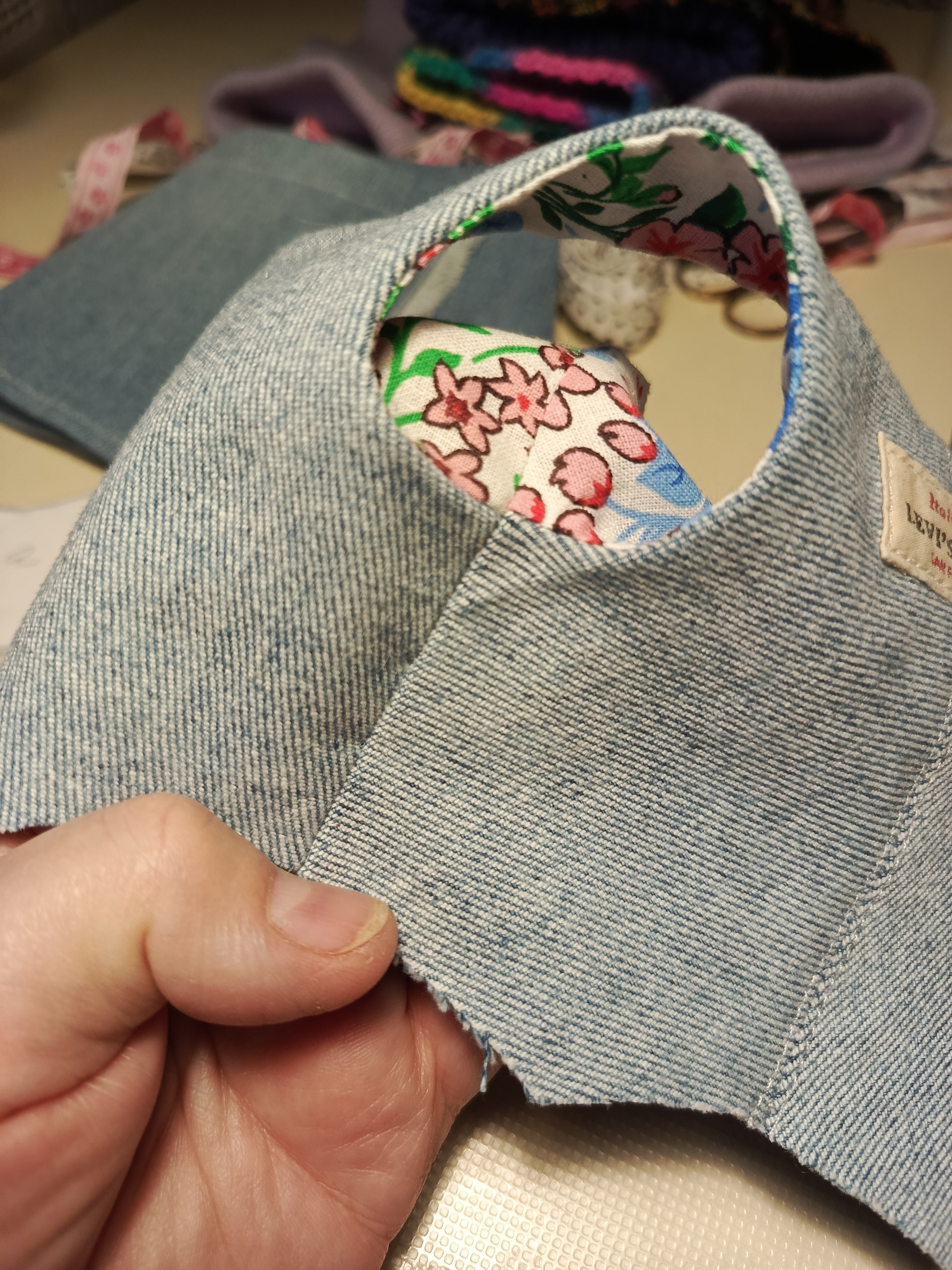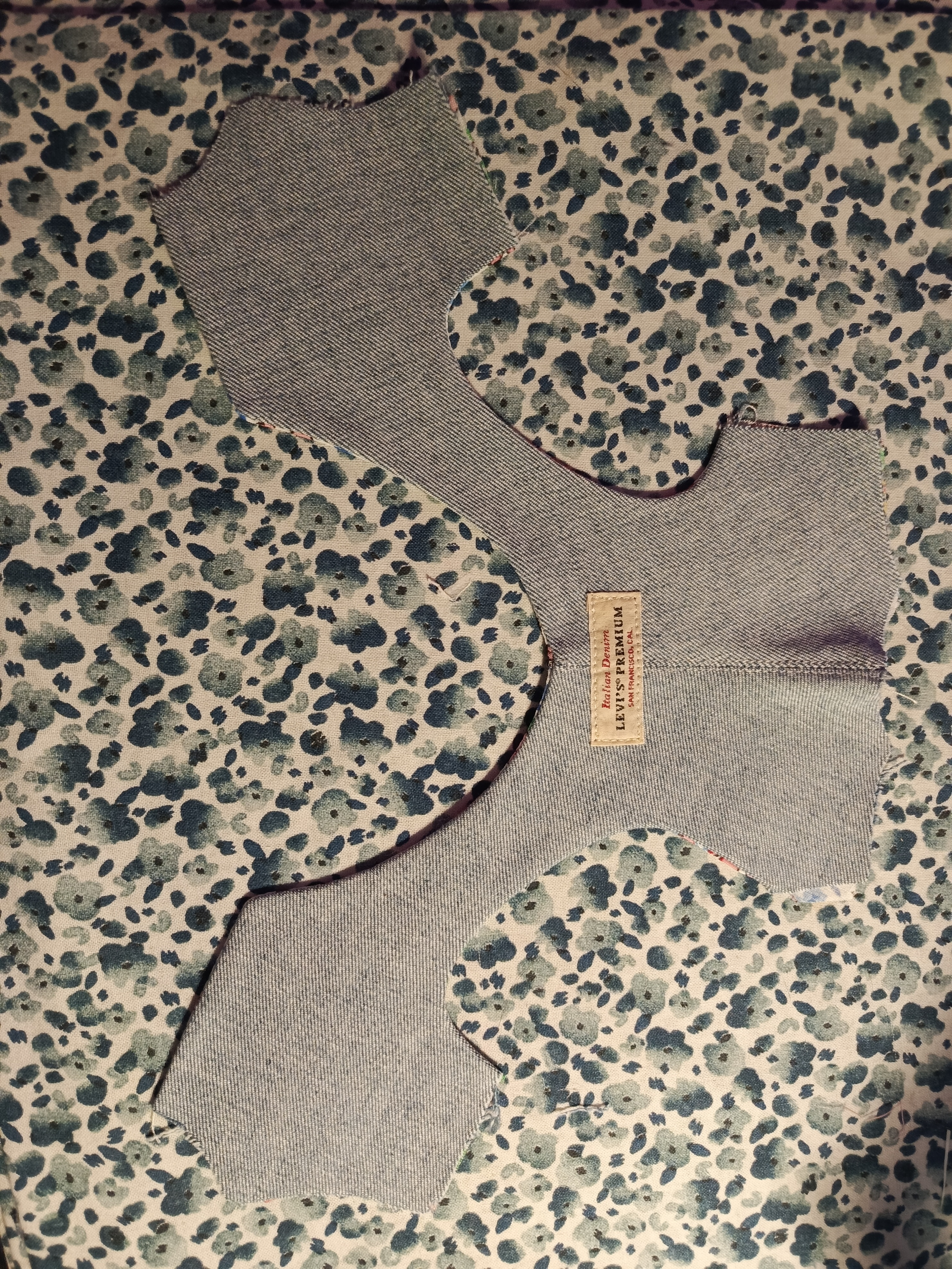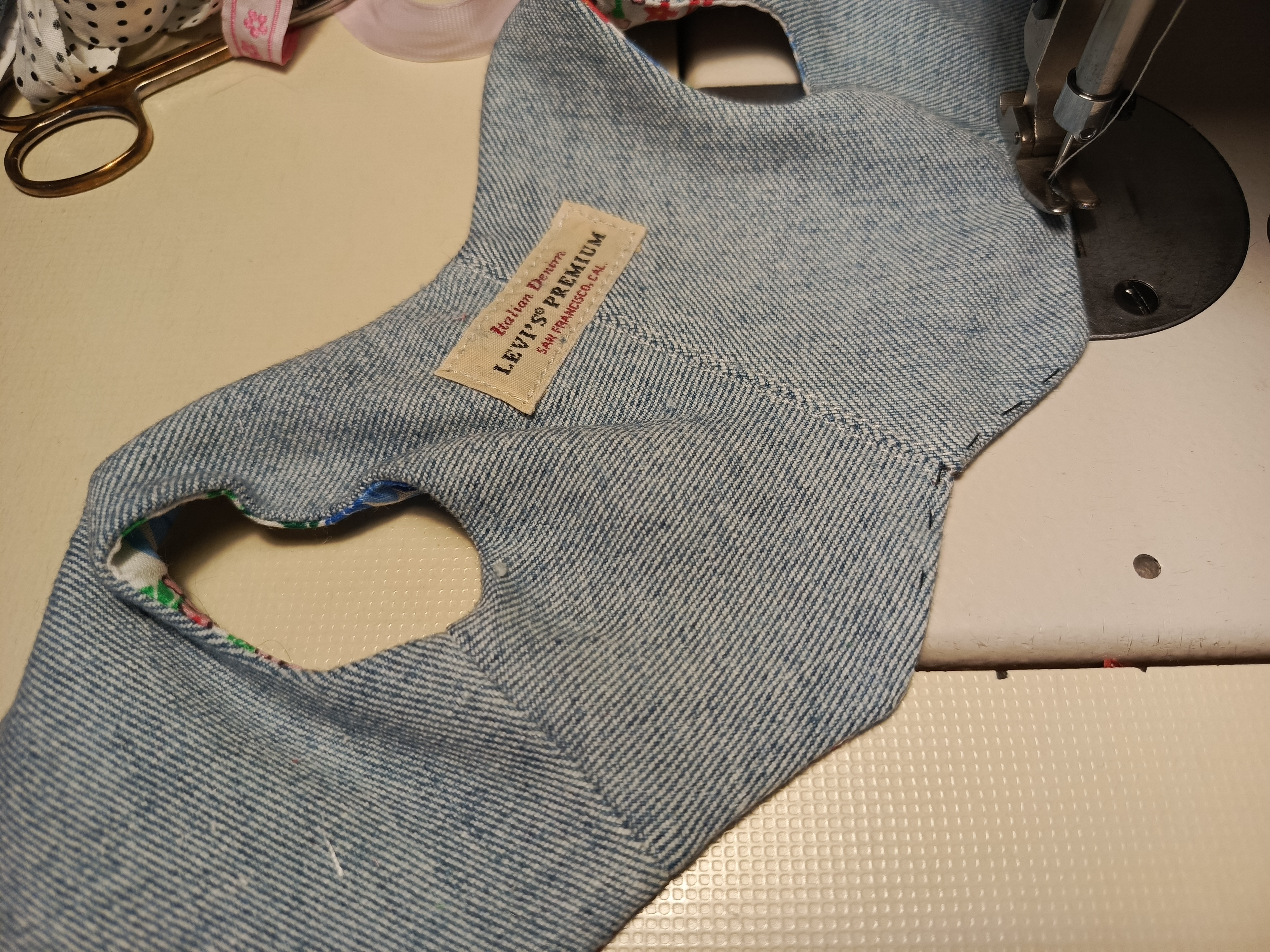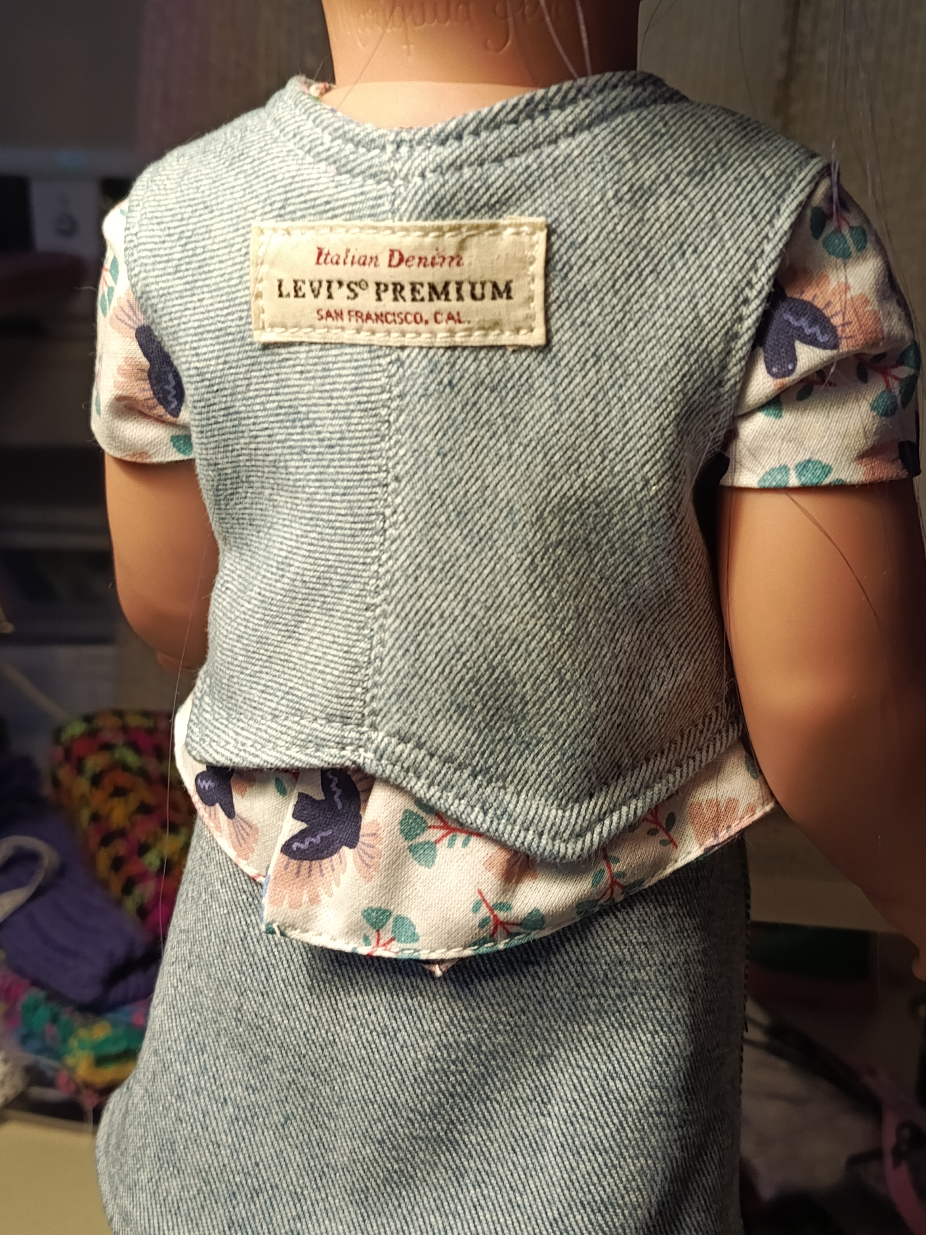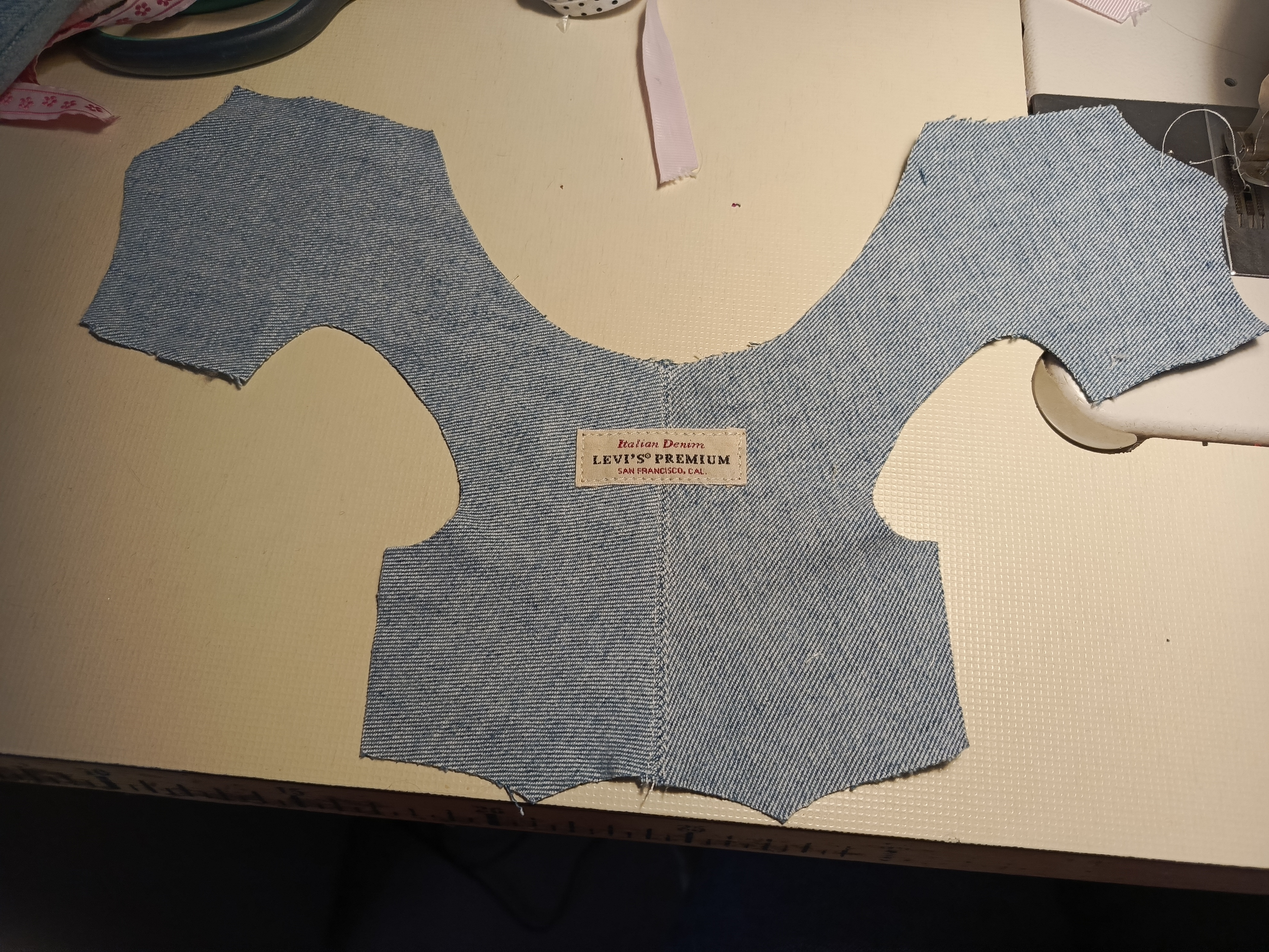 Стачала середину спинки, отстрочила , с джинсов срезала эмблему и решила пришить. Для чего - не знаю. Просто так.