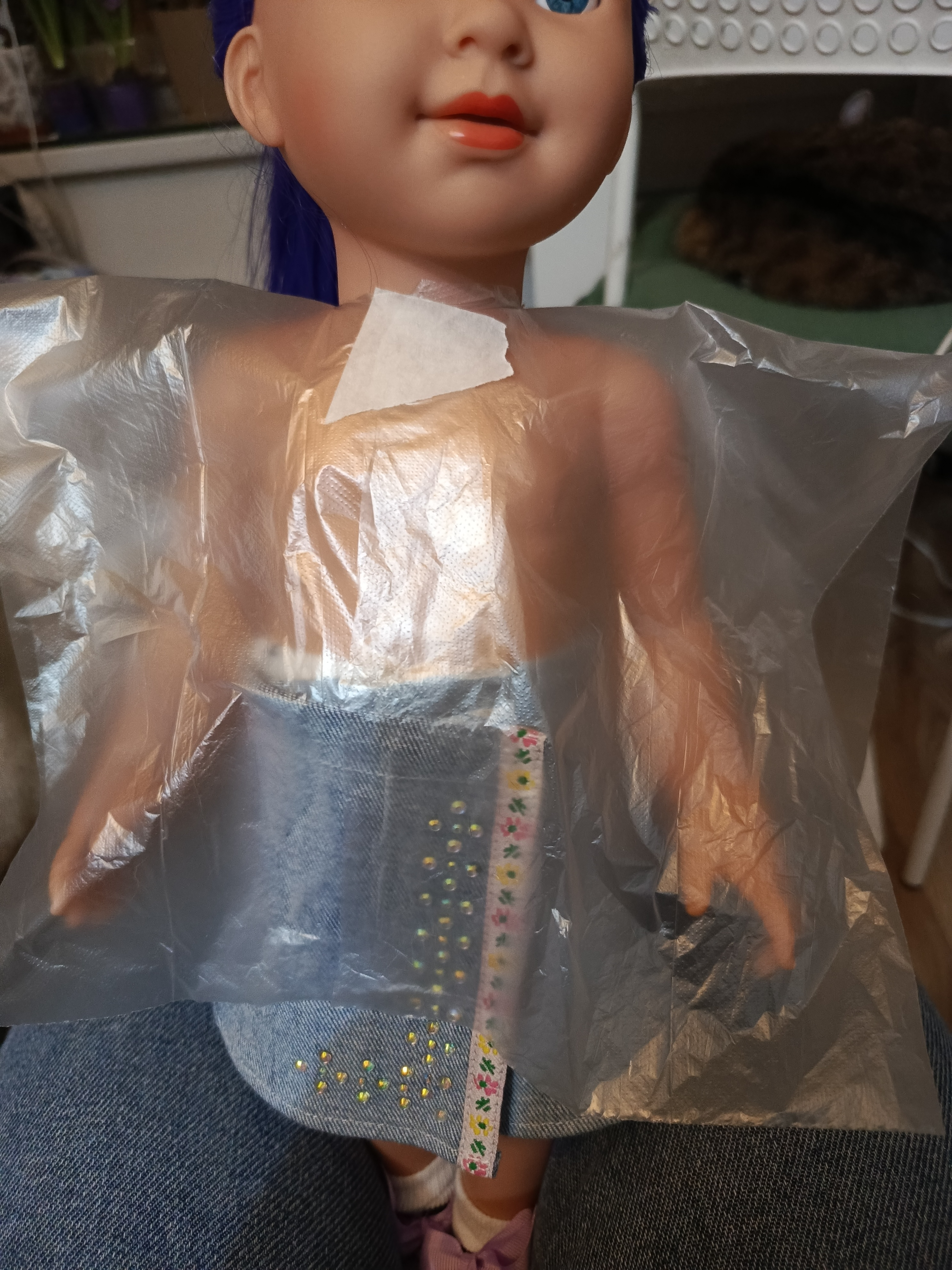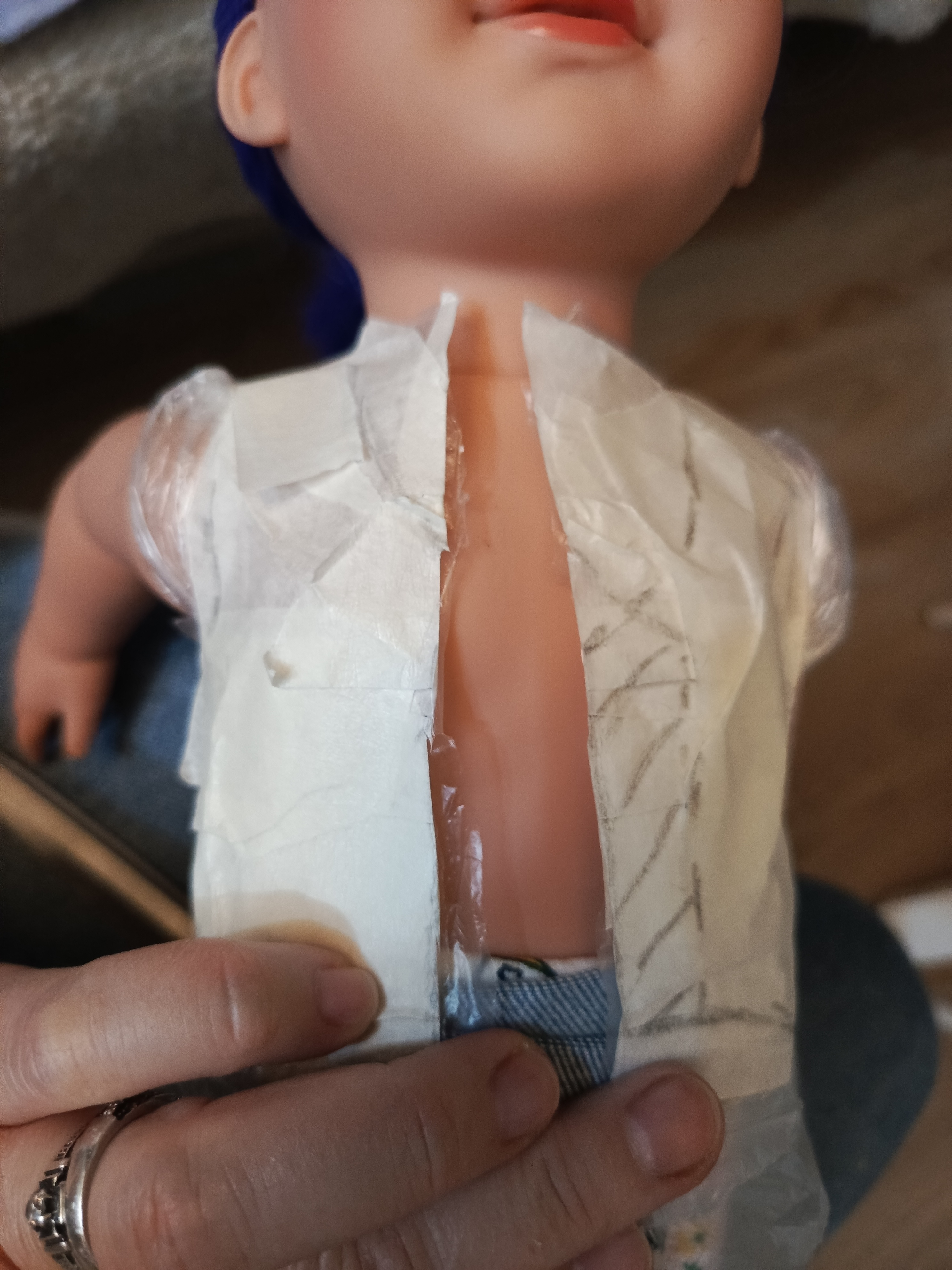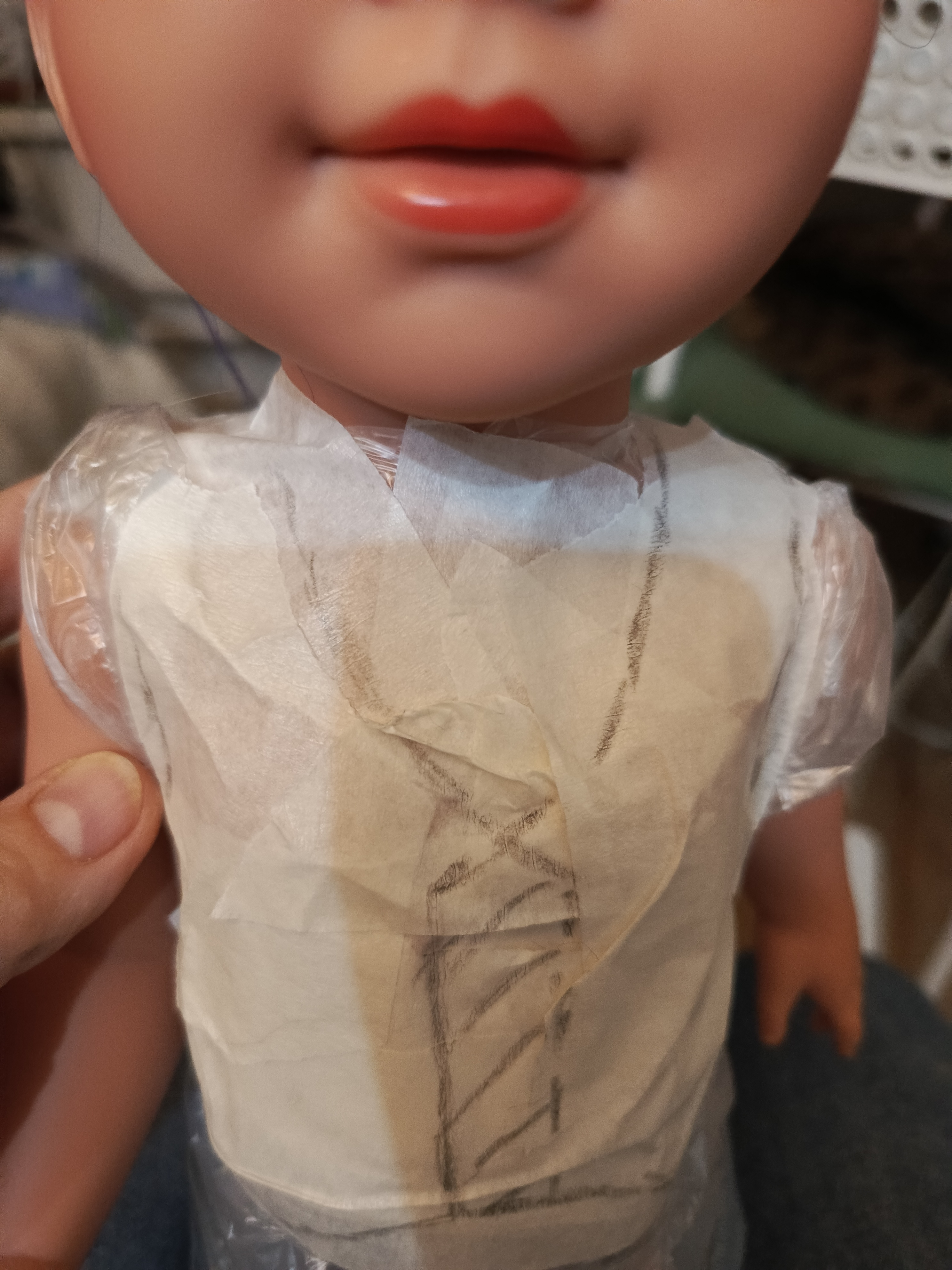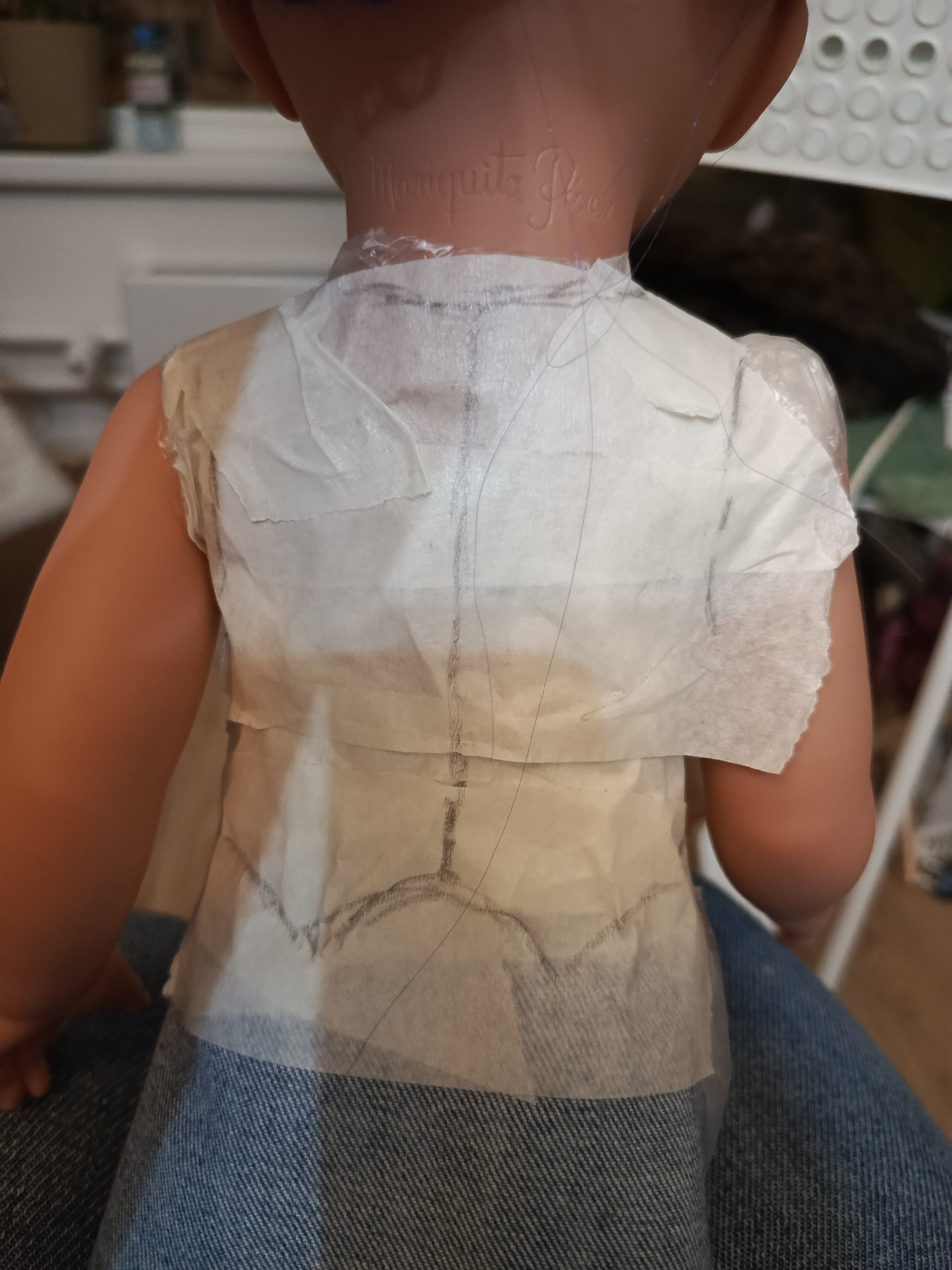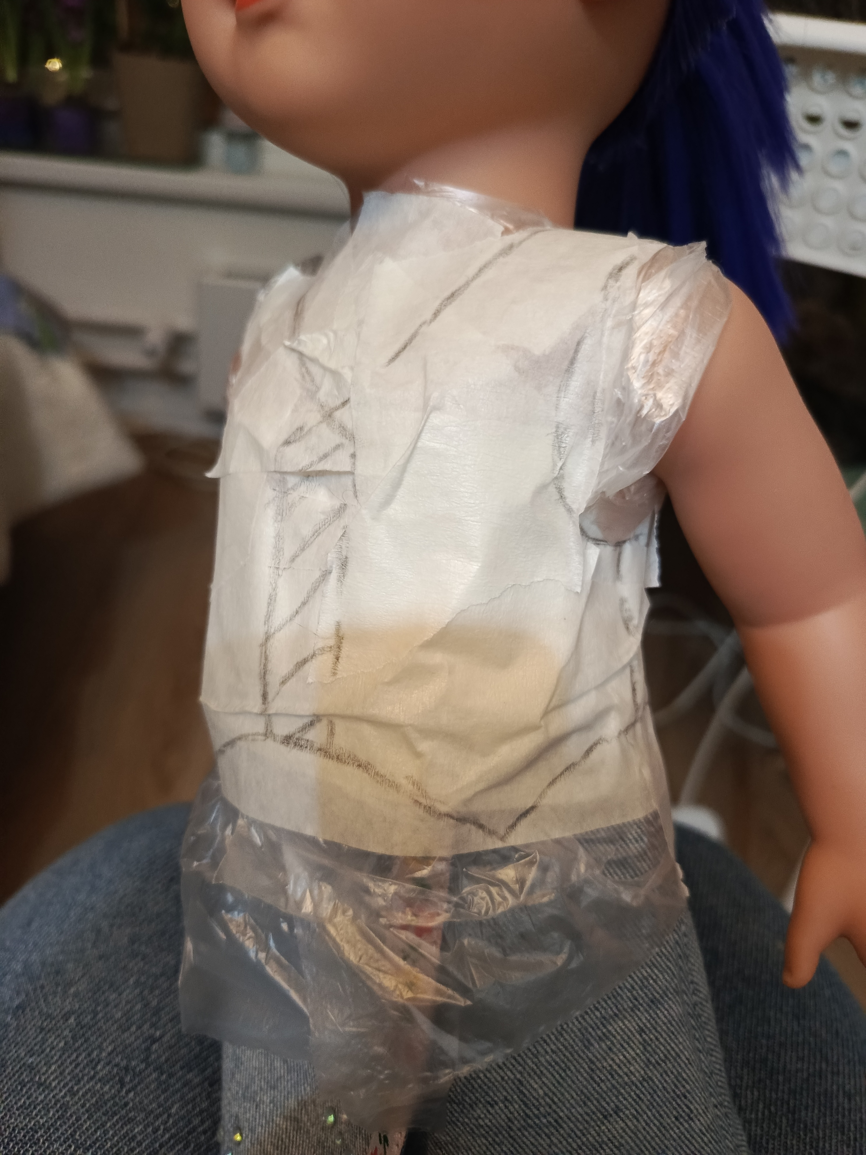 Принцип построения выкройки тот же, что и у юбочки. Берем пакет, скотч( лучше бумажный, т к надо будет отрывать мелкие кусочки) и куколку.