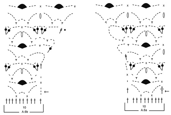 Для всех размеров: после того, как схемы будут провязаны в высоту (помимо схемы А.6а), повторять послед. 4 ряда схем. Петли правого и левого плеч сейчас вязать вместе в 10-ом ряду: вязать 10 ряд по схеме А.6а на петлях правого плеча, набрать новые 18 возд.п. для выреза горловины, вязать 10 ряд по схеме A.6b на петлях левого плеча. Повернуть вязание и выполнить след. ряд (послед. ряд по схемам). Теперь вязать 2 раза по схеме А.7 на петлях воротника. Теперь 14-16-16-18 повторений по схеме А.3 в ширину.