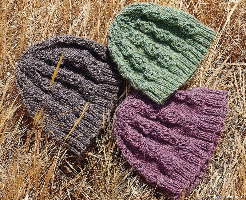 Вам потребуется: пряжа (80% овечьей шерсти, 20% шерсти опоссума; 100 м/50г) — 100 г зеленой, серой или фиолетовой; короткие круговые спицы №4 и 4,5; комплект чулочных спиц №4,5.