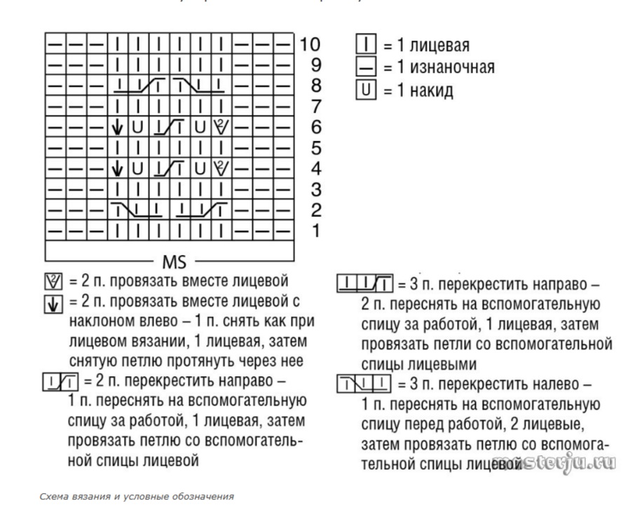 Ажурный узор с «Косами». Вязать круговыми рядами: число петель кратно 12. Вязать по приведенной схеме. На схеме даны четные и нечетные круговые ряды. Постоянно повторять раппорт и 1–10-й круг.р.