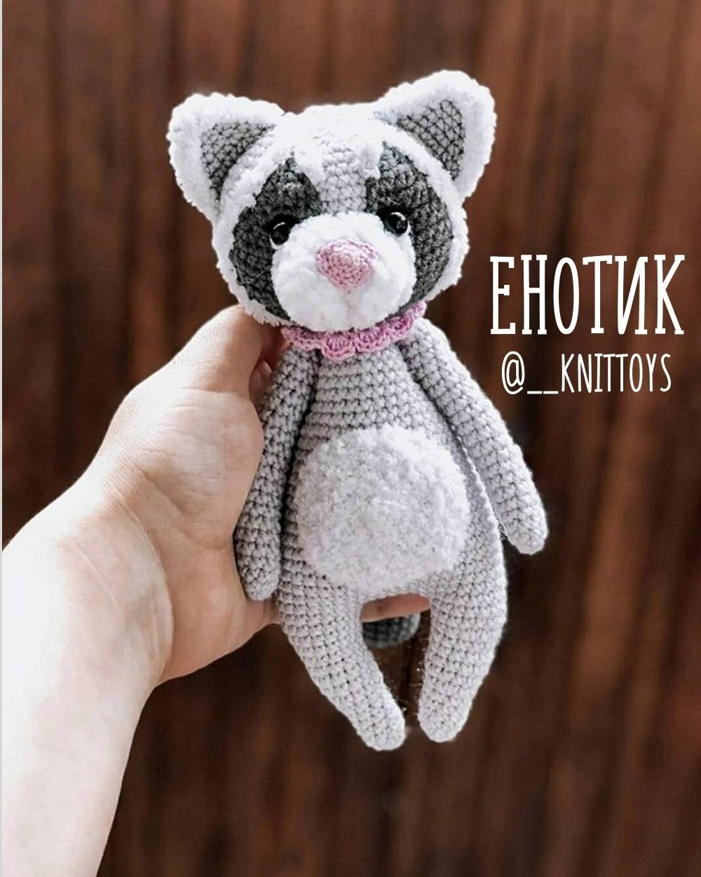 Этот восхитительный вязаный енот — истинное произведение искусства! Очаровательные детали, такие как пушистая мордочка и милый розовый носик, делают его невероятно милым. Серо-белая цветовая гамма придаёт игрушке стильный и современный вид. Кружевной розовый ошейник добавляет изящества и завершает образ. Это чудесное рукодельное изделие станет идеальным подарком или украшением интерьера.