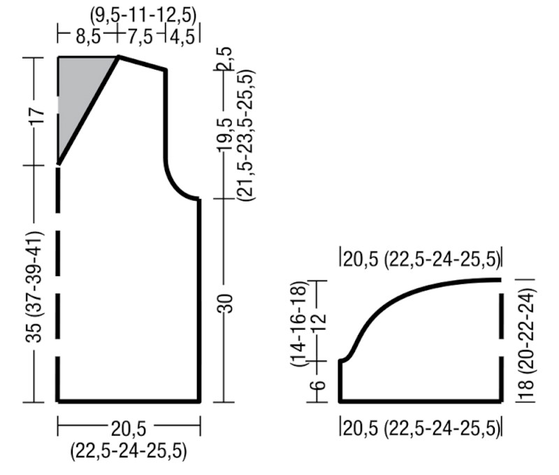 Перед. Вязать, как спинку, до **. Продолжить вязание без убавок до тех пор, пока высота проймы не составит 10 (11) 12 (12) 13 см (последний ряд = изн. ряд).