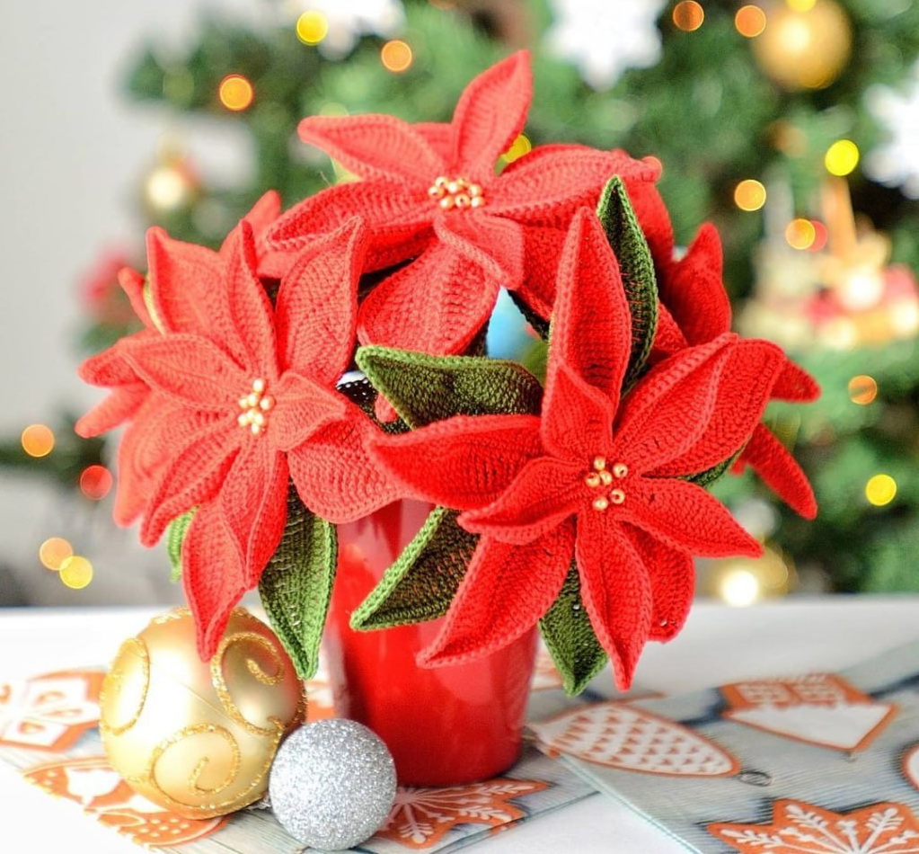 Вязаные пуансеттии, представленные на фото, выполнены с высокой детализацией: яркие красные лепестки, аккуратно связанные крючком, и мелкие бусины, имитирующие сердцевину цветка. Эти элементы подчеркивают мастерство и внимание к деталям.