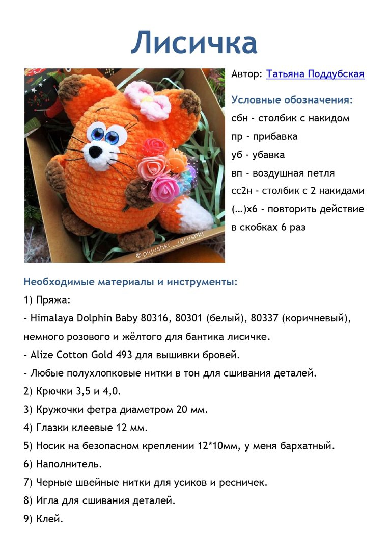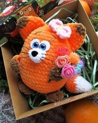 Эта очаровательная лисичка пришла с букетом цветов и цветком на ушке! Она связана крючком с любовью и заботой, и ее большие синие глаза точно привлекут внимание каждого.