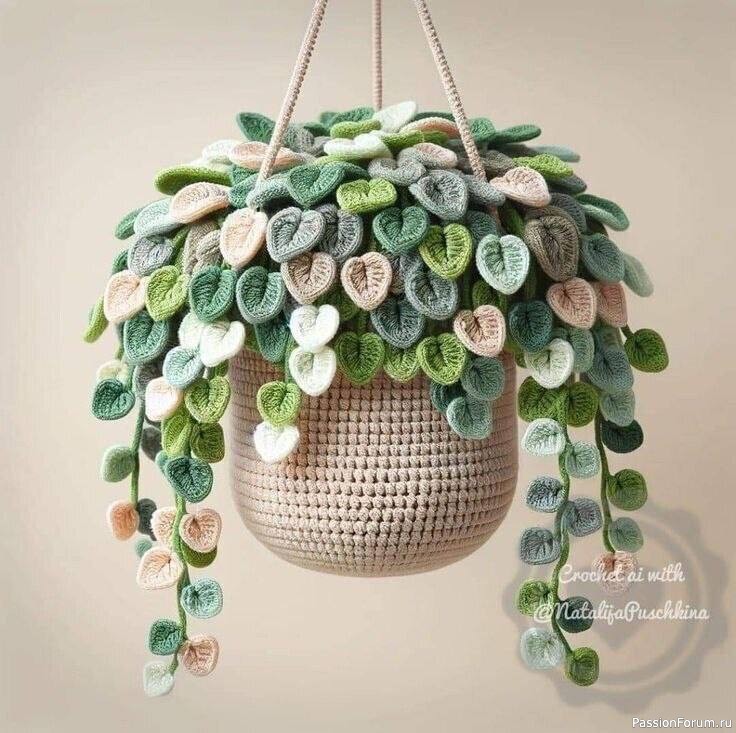 Этот уникальный предмет интерьера привносит уют и стиль в любой дом. Каждый листик выполнен с любовью и вниманием к деталям, создавая эффект пышной зелени. Использование различных оттенков зеленого и нежных пастельных тонов делает кашпо особенно привлекательным, а текстура вязаных элементов придает ему оригинальность.