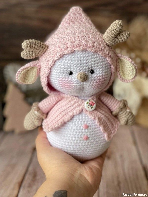 Этот очаровательный олень одет в нежно-розовую шапочку с рожками, которая придает ему особый шарм. Обратите внимание на аккуратные пуговички и изящную вышивку на плаще. Как думаете, куда он отправляется в своем стильном наряде?