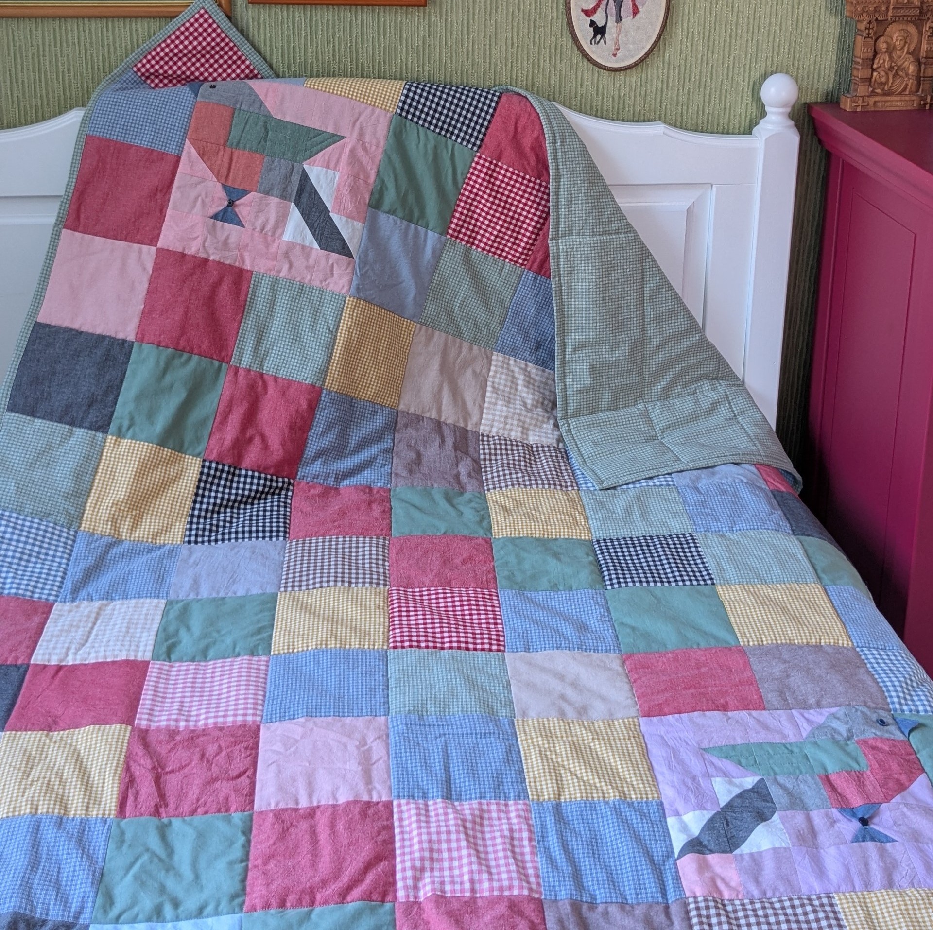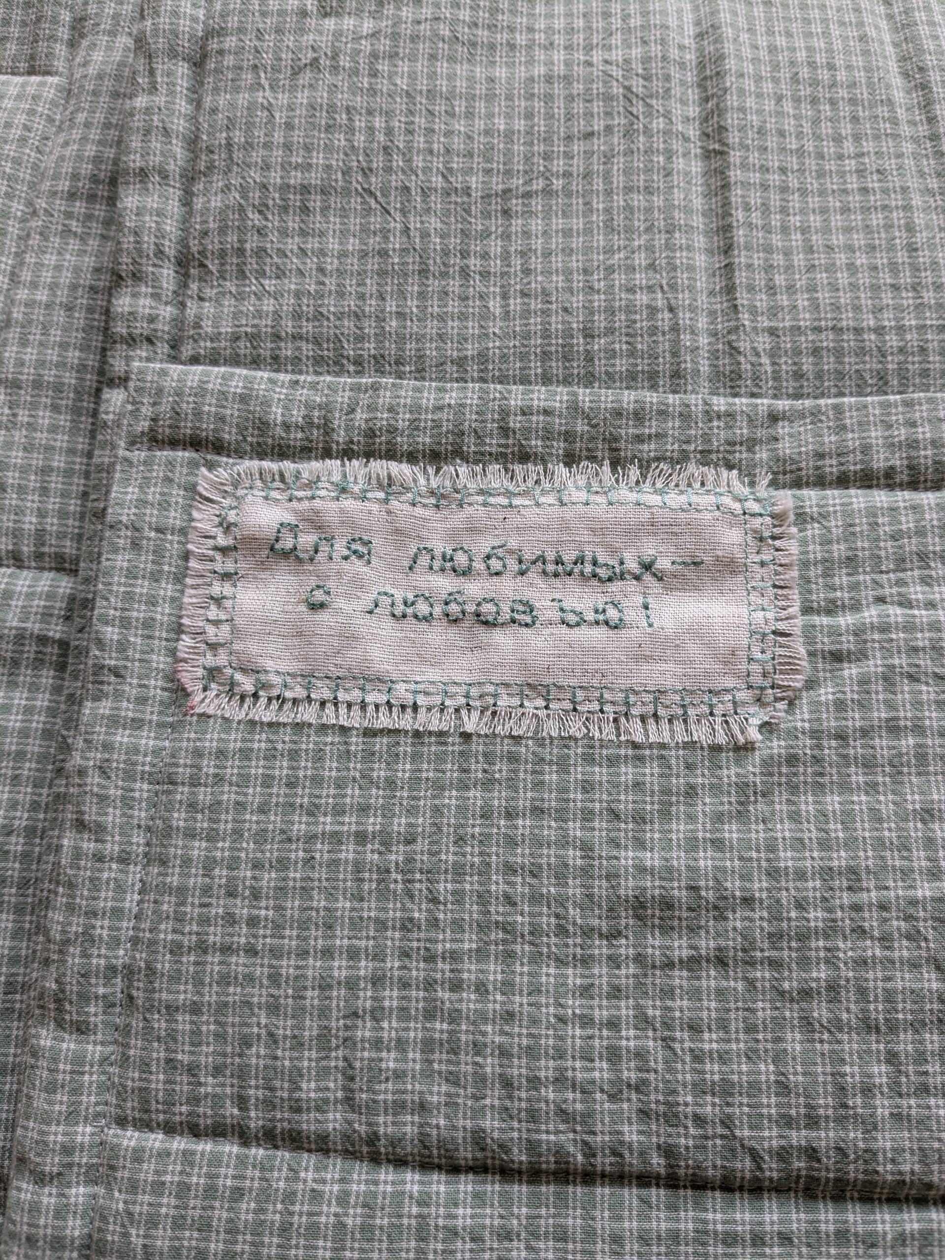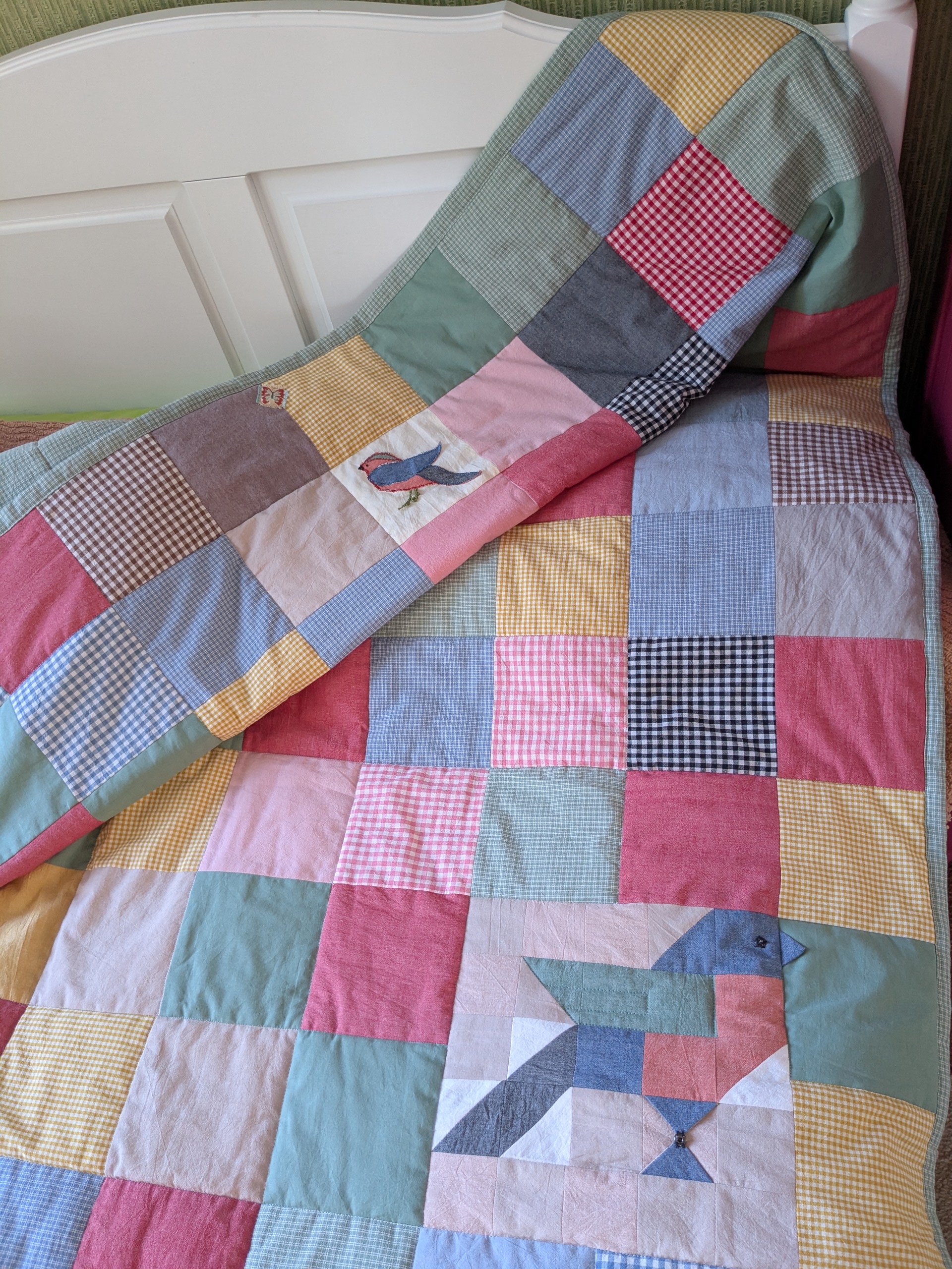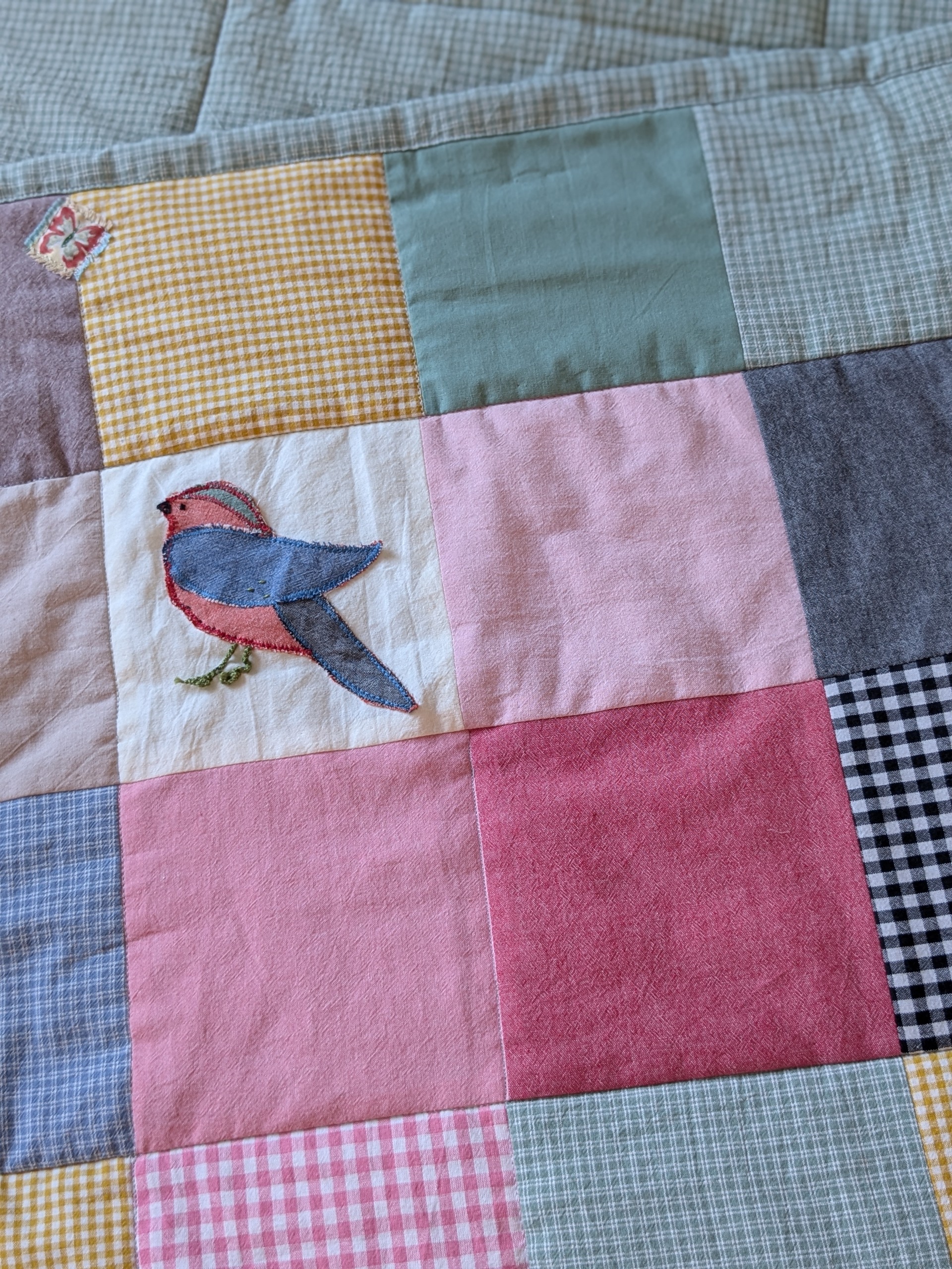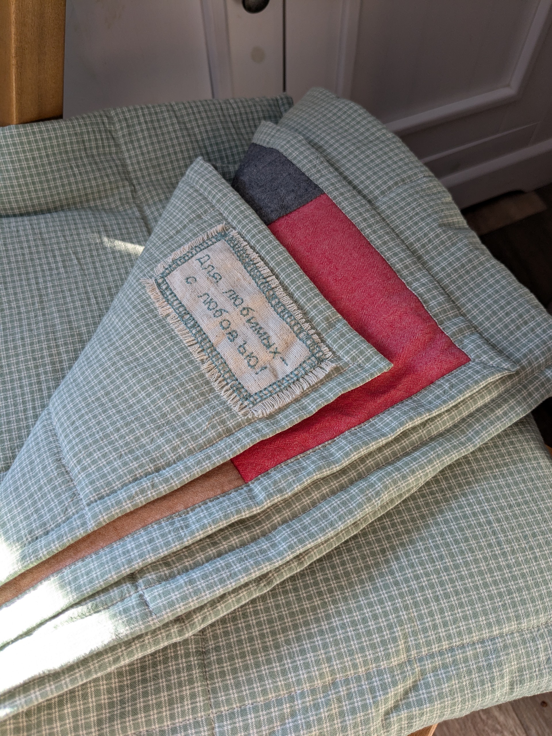 Как здорово! Сама я большая поклонница лоскутного шитья, мне очень понравились маленькие детальки- птички, нашивка с «посланием». Очень трогательно, очень мило.