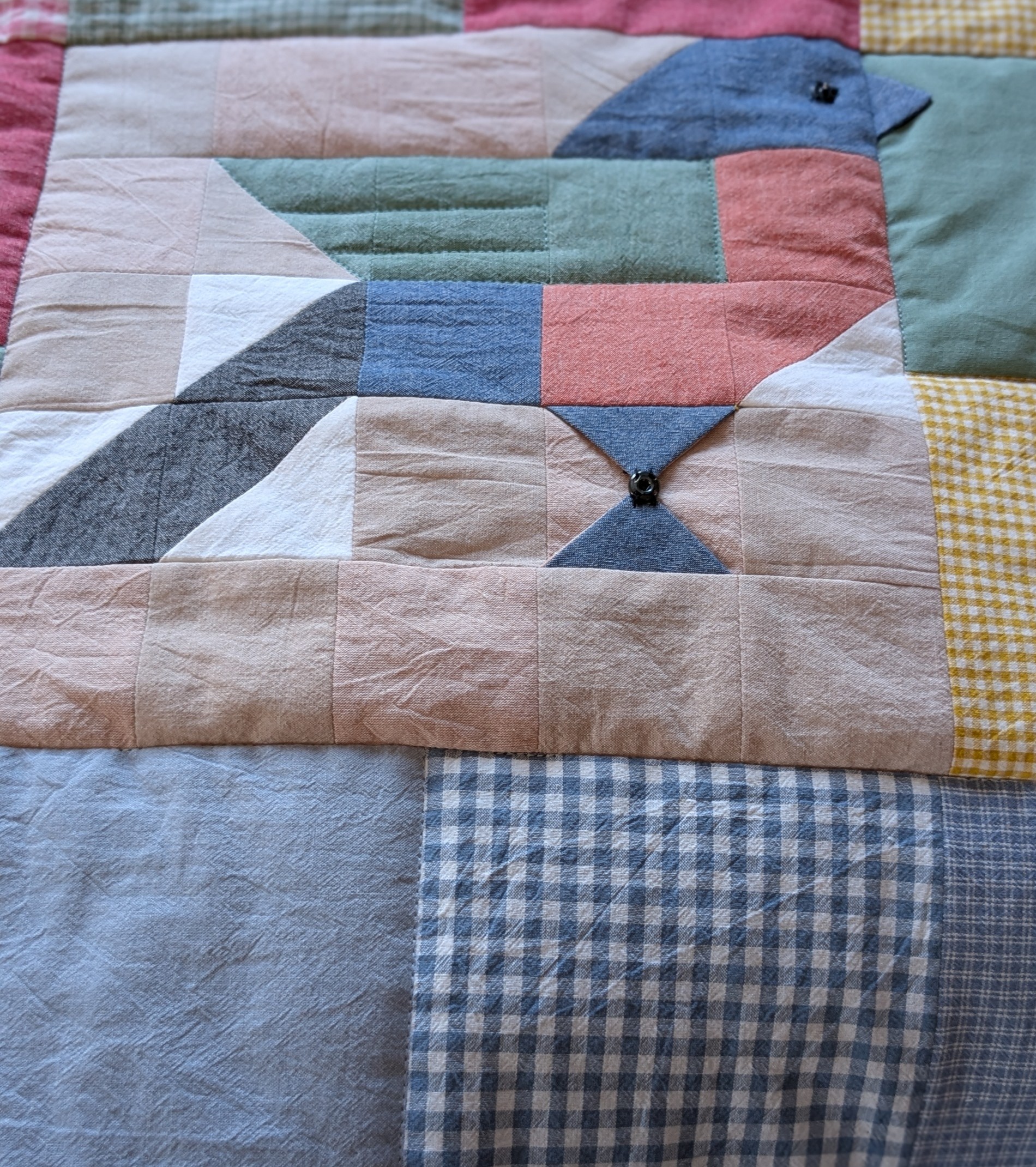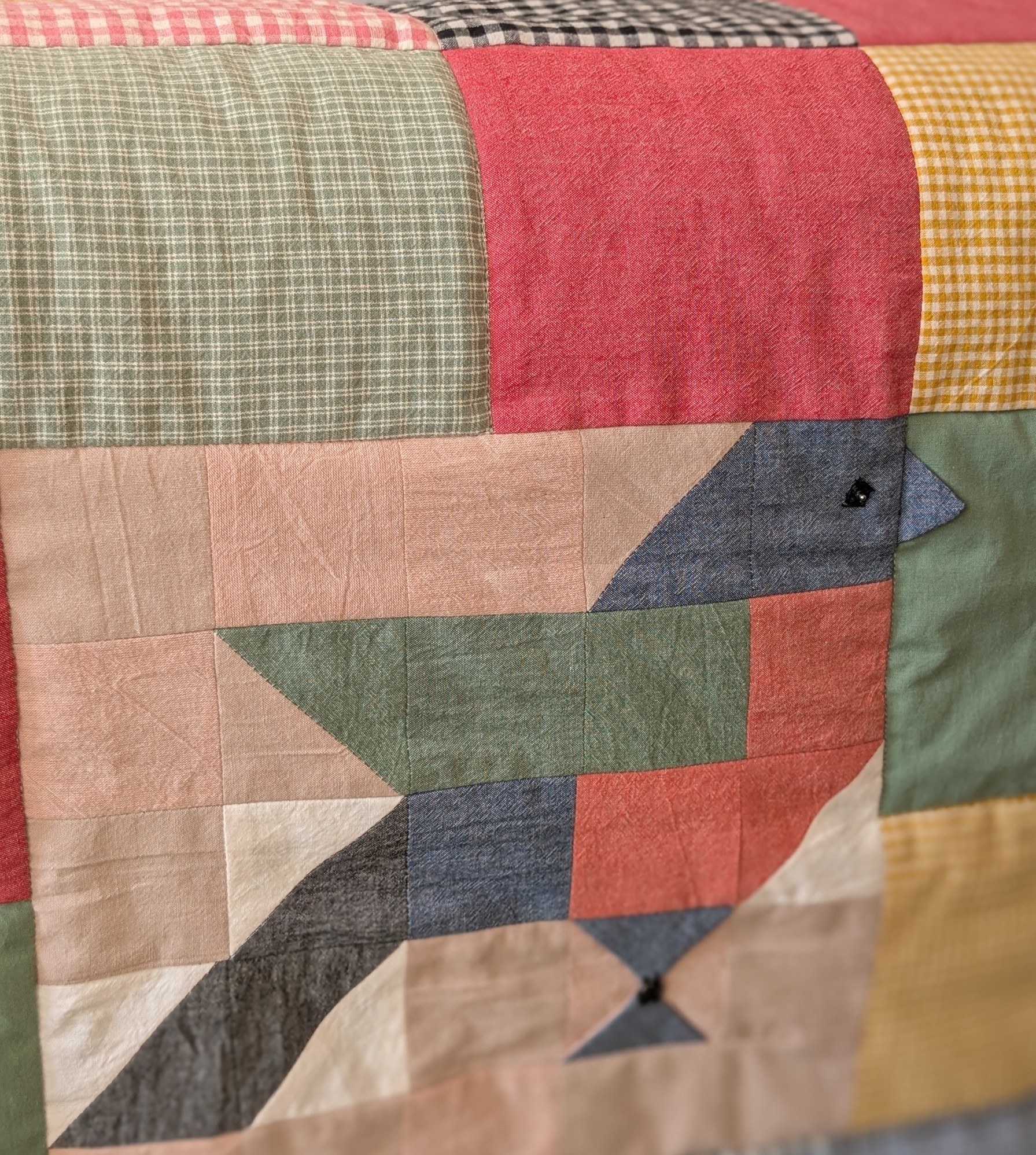 Подготовительный процесс был длительный. Давно шила две вещи из лоскутков. Сейчас же нужно было резать новую ткань. Не была уверена, что получится, поэтому отказалась от дорогой ткани для пэчворка и остановила выбор на наборах вареного хлопка, а уже к ним подобрала другие цвета. В ткани не ошиблась. Во-первых, цветовая гамма — мягкая, приглушенная — самое то, что надо для детской комнаты подрастающих мальчишек! Во-вторых, тактильные ощущения — завернешься в одеяло как-будто в теплый уютный кокон! Мои внуки так сразу и сделали! Первоначально никаких сложных блоков не планировала (пока дилетант в этом). Самые простые квадраты. Но когда сделала раскладку, поняла, что чего-то не хватает. Младший обожает птиц. Так стал создаваться блок с птицей.