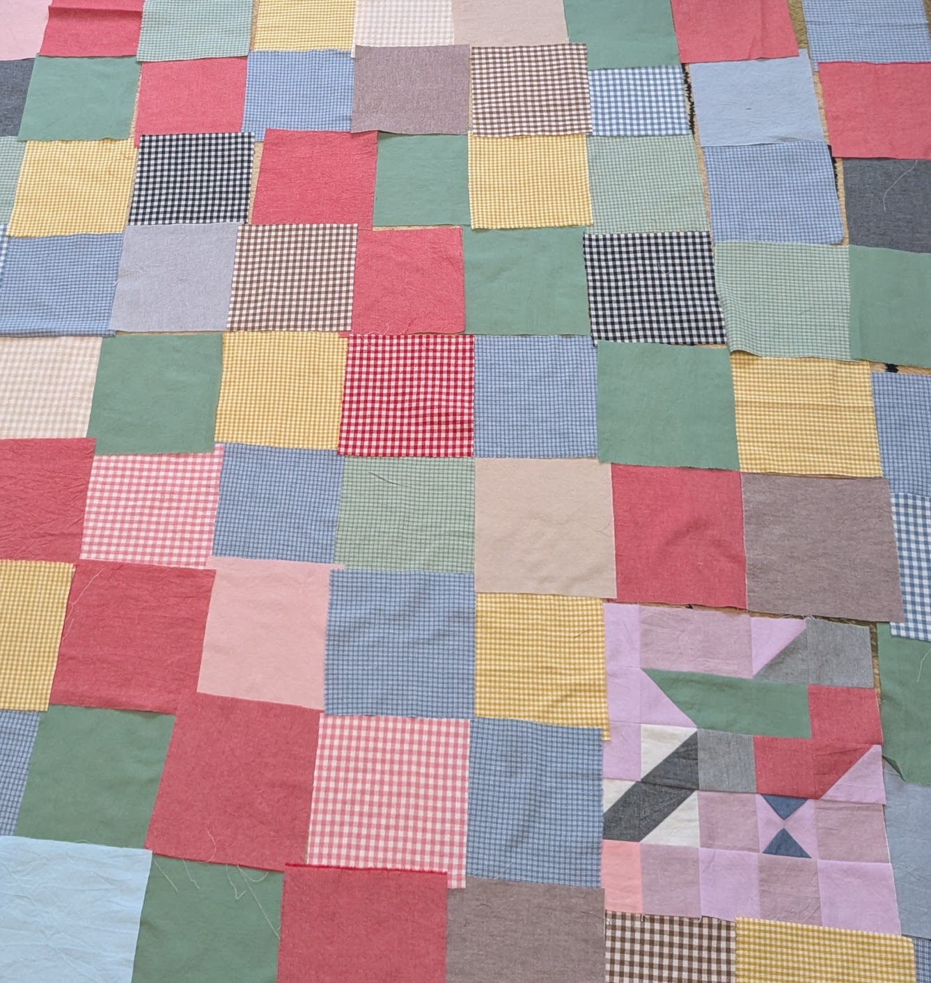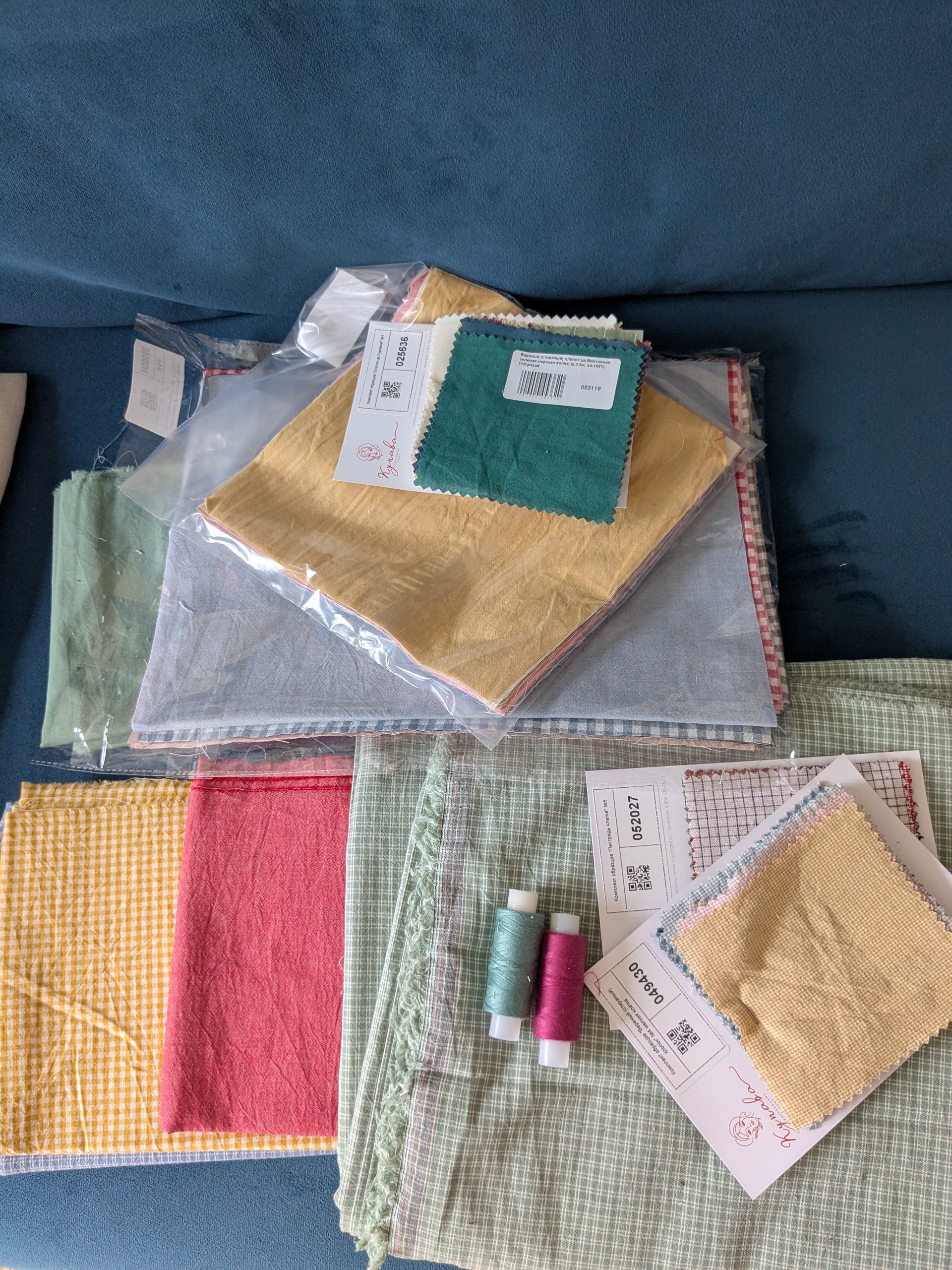Рада, что оценили работу начинающего. Правильно, все ткани — это вареный хлопок. Покупала (вы, судя по рассказам, там тоже частый гость) два набора — один однотонный 25 штук 20х20 см, другой — в клетку 12 штук 30х45. Исходя из этих размеров квадрат кроила 14х14 см. И к ним дополнительно четыре вида ткани метражом по 30 см и 2,5 на оборотную сторону. Впервые с ним работала, приятно удивлена, что дают маленькую усадку после ВТО. Первоначально, когда ткани разложила, не увидела общей картины, т.к. по цветовой гамме показались совершенно несовместимые, особенно светлые. Но они чудесным образом легки фоном для птиц. И еще понравились тактильные ощущения. Американский хлопок хорош во всех смыслах, без сомнения, но он холодный на ощупь и очень яркий. Не для этого проекта. Зато какие из него получаются жилеты (я не шью лоскутные, только на подкладе классического кроя) и детские рубашки. Да, есть кухонные шторы, штуки три фартука и дорожки на стол. Тоже не лоскутные...