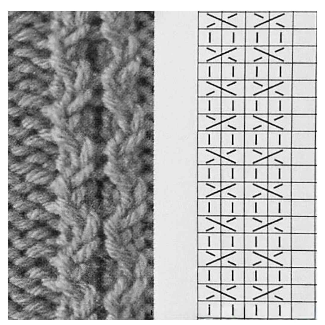 2 лиц петли, перекрещенные вправо ( провязать лицевой сначала 2-ю петлю, располагаю её перед 1-й, затем 1-ю), 2 лиц петли, перекрещенные влево (провязать лицевой сначала 2 петлю, располагая её за 1-й, затем 1-ю петлю