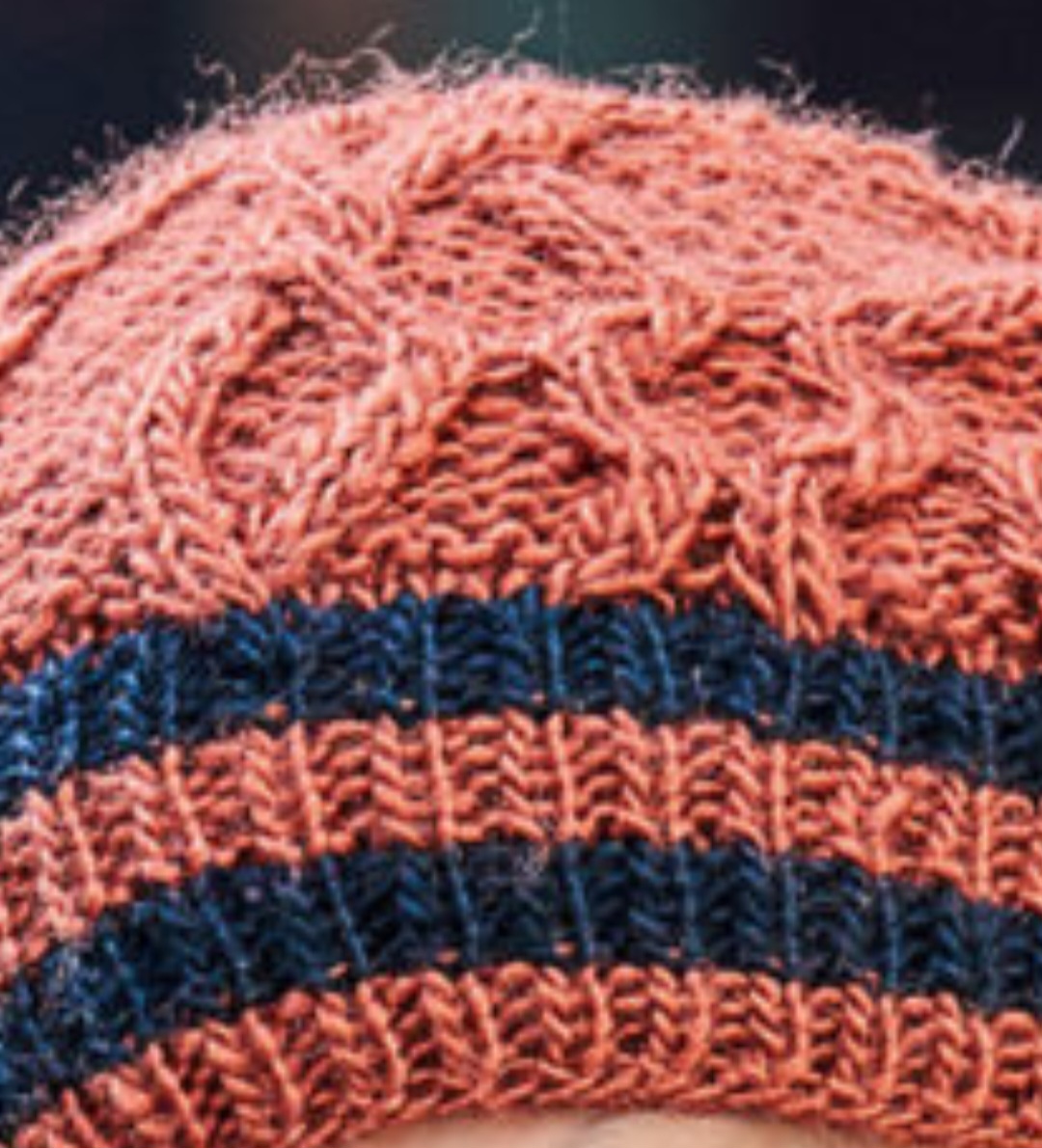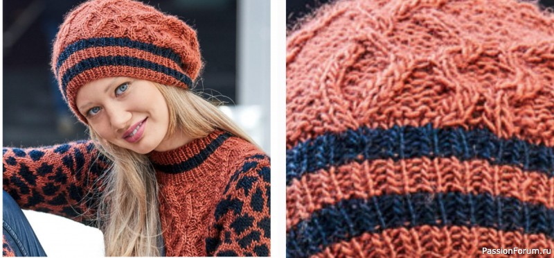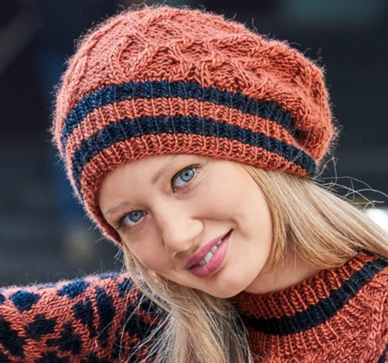 Берет с узором из кос и полосами спицами