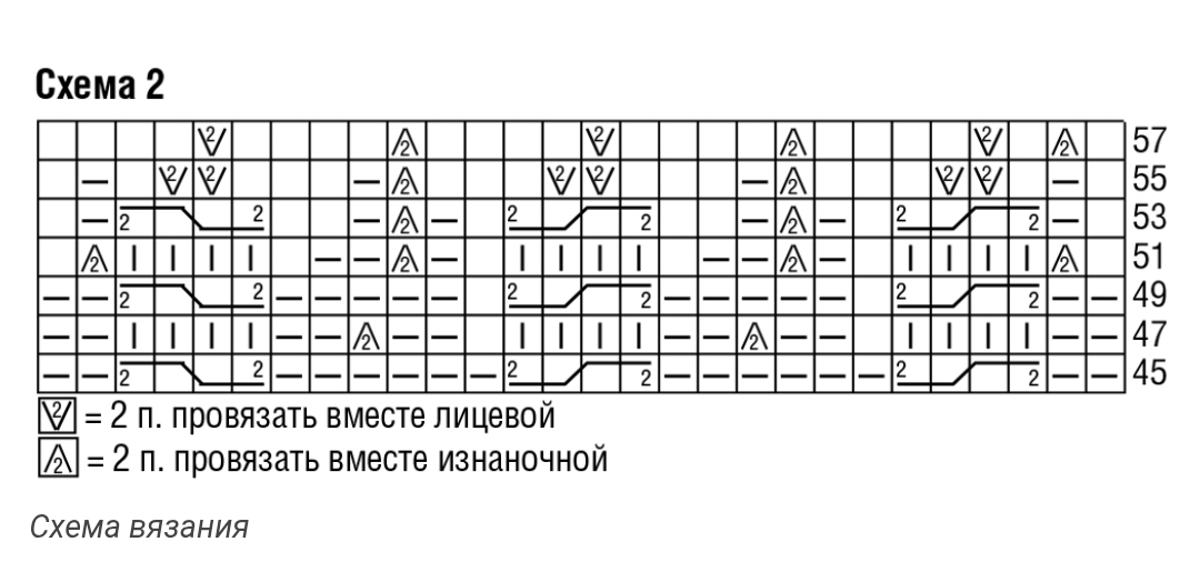 Через 19,5 cм = 44 круг.р. от планки продолжить работу по схеме 2, выполняя убавки, как показано (по мере уменьшения количества петель перейти на чулочные спицы № 5,5).