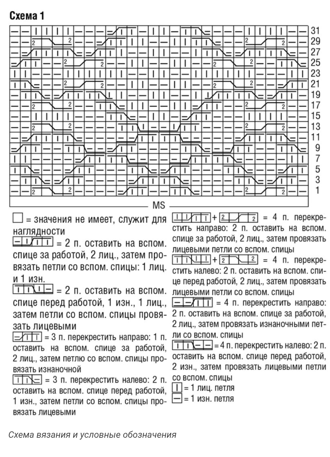 Вязать по кругу сначала по схеме 1. На схеме даны нечетные ряды. В четных рядах петли провязывать по рисунку. В высоту выполнить 1 раз с 1-го по 32-й круг.р., затем повторить еще 1 раз с 1-го по 12-й круг.р. = всего 44 круг.р.