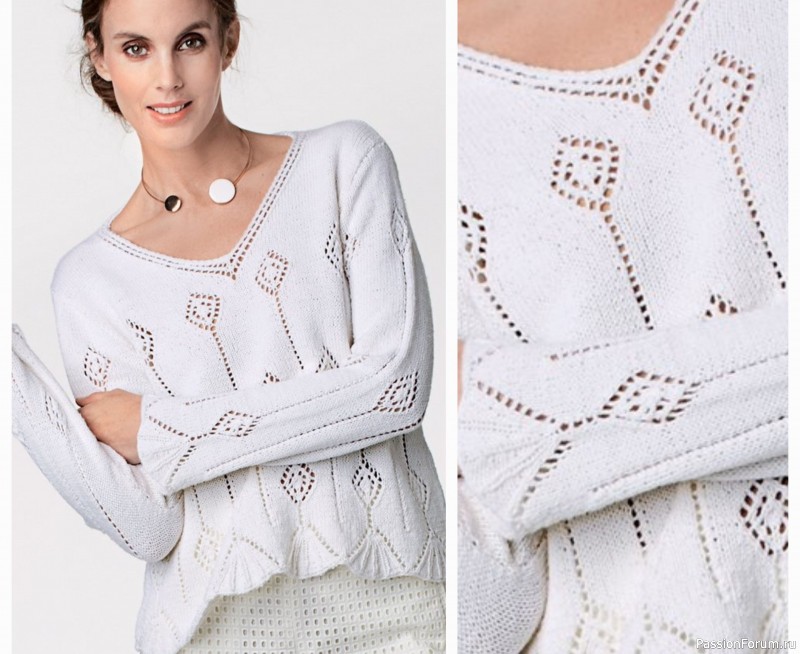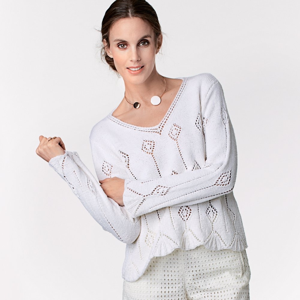 Белый пуловер с деликатным геометричным узором в рустикальном стиле выглядит ультрасовременно.