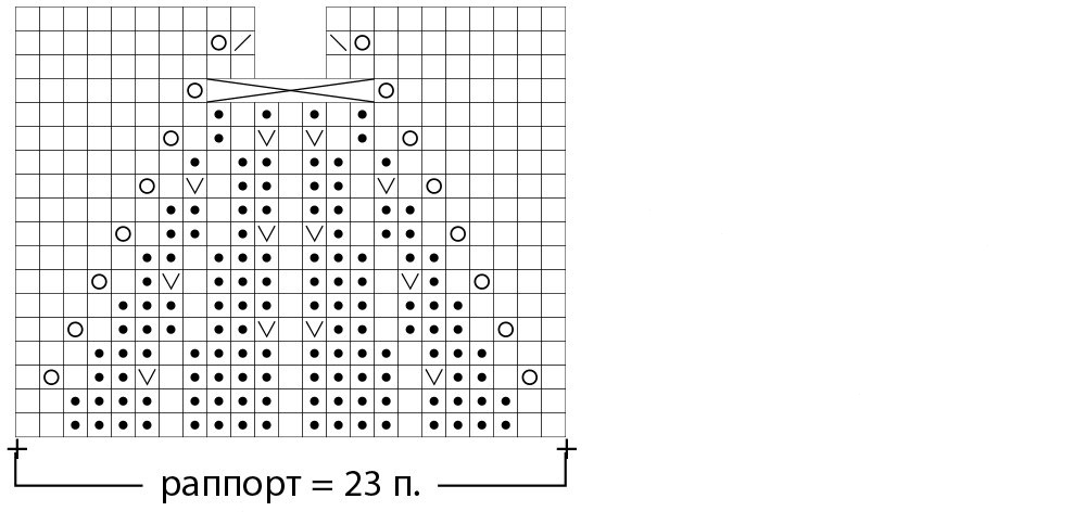 Продолжить работу волнистым узором по соотв. схеме, кромочные петли во всех рядах (и всех узорах!) провязывать лицевыми, раппорт из 23 п.