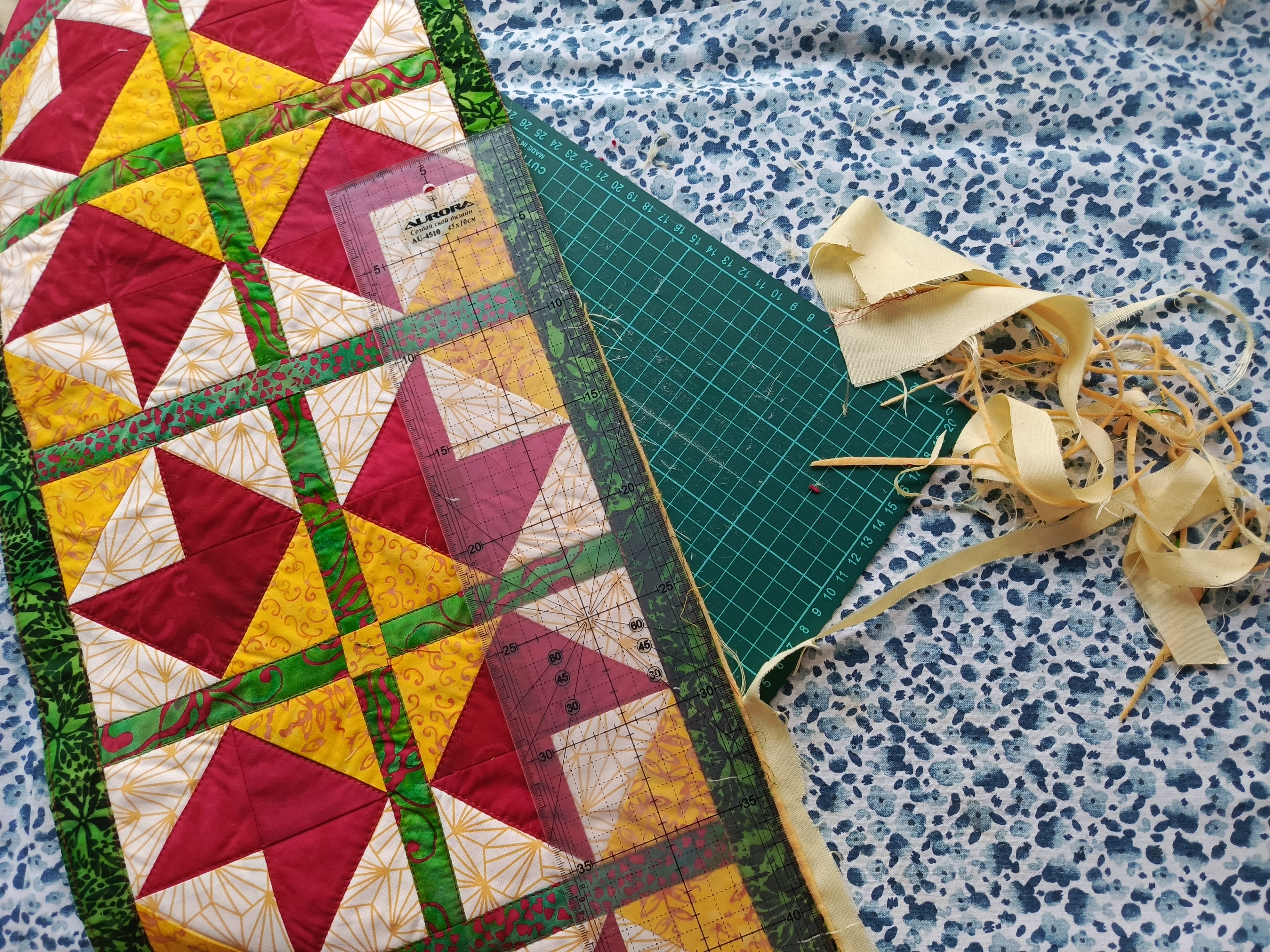 У Лады Христенко в ролике увидела новогоднюю дорожку, а у меня как раз залежались ткани красно- желто- зеленых цветов.