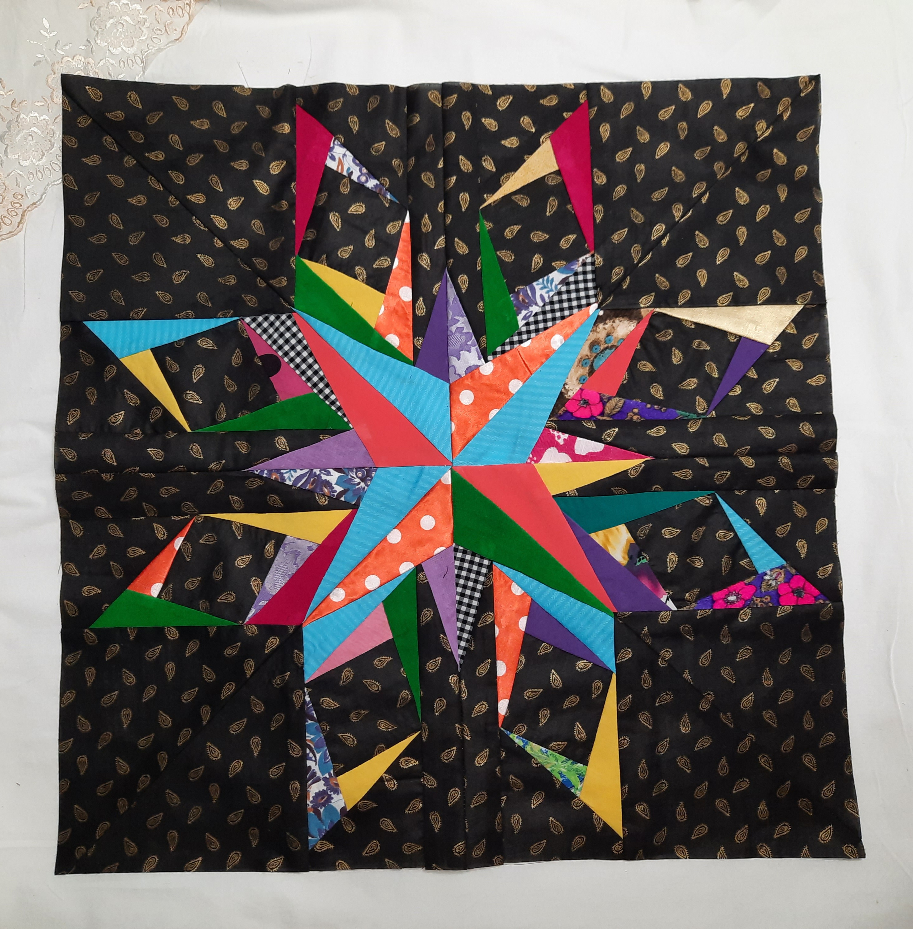 Представляю вашему вниманию новый сшитый блок.Когда впервые я его увидела в интернете,даже не представляла КАК шьется такая красота. Эти парящие в воздухе ромбы были недоступны моему пониманию. Поднабравшись опыта сделала. Цвета особо не подбирала и один лучик оказался зеленым))))Если кого-нибудь заинтересует предлагаю схему пошива