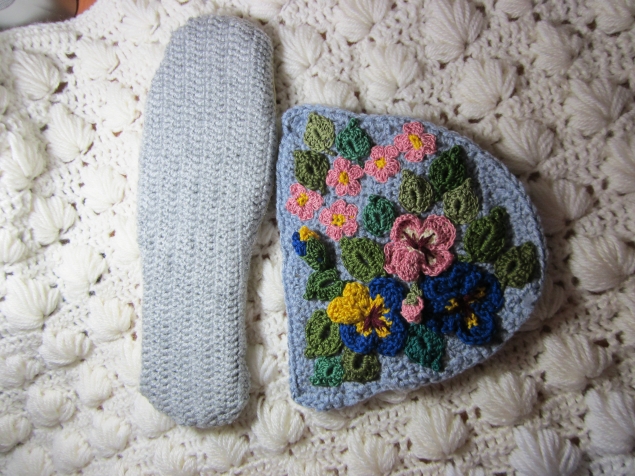 Эти цветочные тапти-лапти связались ко дню рождения моей Владушки. Доченька была в восторге: "Тёпленькие, мягонькие и красивущие! Ни у кого таких нет!"