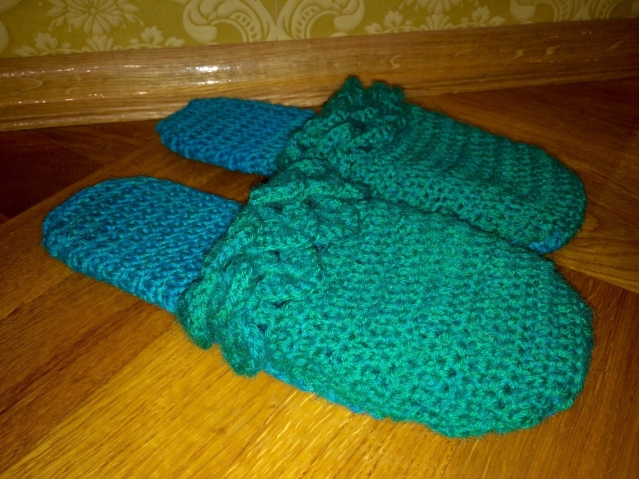 В этом году я уже вязала тапки крючком. Обвязывала стельку с обеих сторон, а потом вывязывала верх. Получились такие вот шлепки, и племянник рад подарку. Говорит, что носит не снимая. Кстати, фото тоже его. Я не успела сфотографировать: надо было срочно отсылать, чтобы успеть ко дню рождения.