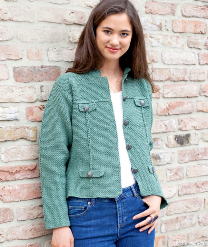 Клапаны карманов согл. выкройке пришить на полочки. Выполнить плечевые швы. Вшить рукава, выполнить боковые швы и швы рукавов. Для воротника обвязать край горловины 104 петлями основным узором, при этом начать и закончить на расстоянии 2 см от края борта. Через 6 см от начала обвязывания закончить работу. Воротник наполовину подвернуть внутрь и подшить. Концы воротника сшить матрасным швом. Пуговицы пришить к борту левой полочки на расстоянии 2 см от края борта.
