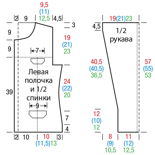 и затем в каждом 4-м ряду еще 7 x 1 п. (в каждом 4-м ряду 7 x 1 п.) попеременно в каждом 3-м и 4-м ряду 7 x 1 п. = 108 (116) 124 п. Через 19 см от начального ряда прибавить с обеих сторон 1 п. и затем в каждом 4-м ряду еще 7 x 1 п. (в каждом 4-м ряду 7 x 1 п.) попеременно в каждом 3-м и 4-м ряду 7 x 1 п. согл. узору = 124 (132) 140 п. Через 35 (33) 31 см от начального ряда пропустить для пройм с обеих сторон 12 п. = 100 (108) 116 п. Через 54 см от начального ряда пропустить для плечевого скоса с обеих сторон 8 (10) 12 п. и в каждом 2-м ряду 1 x 8 п. и 1 x 10 п. (2 x 10 п.) 1 x 12 п. и 1 x 10 п. На оставшихся 48 п. закончить работу через 57 см от начального ряда.