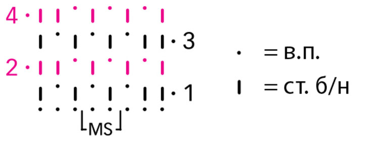Основной узор: четное число петель. Вязать согл. схеме. Начать с петель перед раппортом, раппорт постоянно повторять, закончить петлями после раппорта. Выполнить 1 раз 1–4-й ряды, затем постоянно повторять 3-й + 4-й ряды.