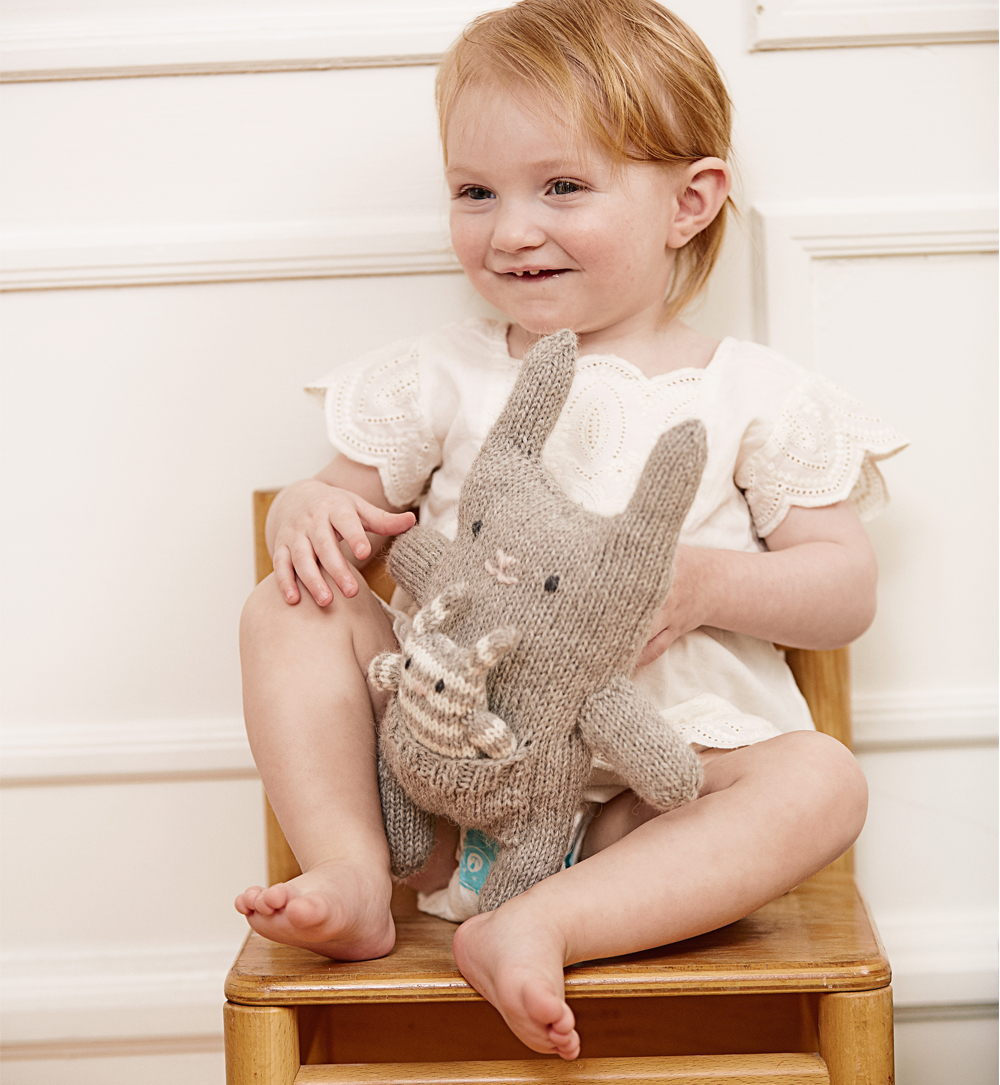 Пряжа (65% шерсти альпака, 35% овечьей шерсти; 50 г/100 м) — 1 моток светло-серой меланжевой, остатки белой, остатки розовой (для носа), остатки серой (для глаз); чулочные спицы №4; синтетическая вата в качестве объемного наполнителя.