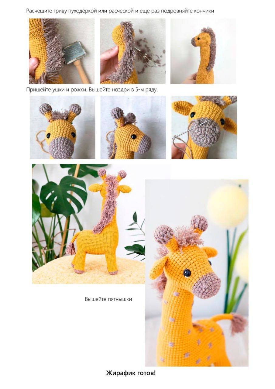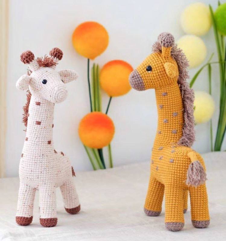 Каждый жираф выполнен крючком с использованием техники амигуруми, что придает им мягкую текстуру и четкие детали. Особое внимание уделено гриве и хвостику из пушистой пряжи, создающей реалистичный объем и тактильное разнообразие. Точки на теле аккуратно вышиты, подчеркивая уникальность каждого экземпляра.